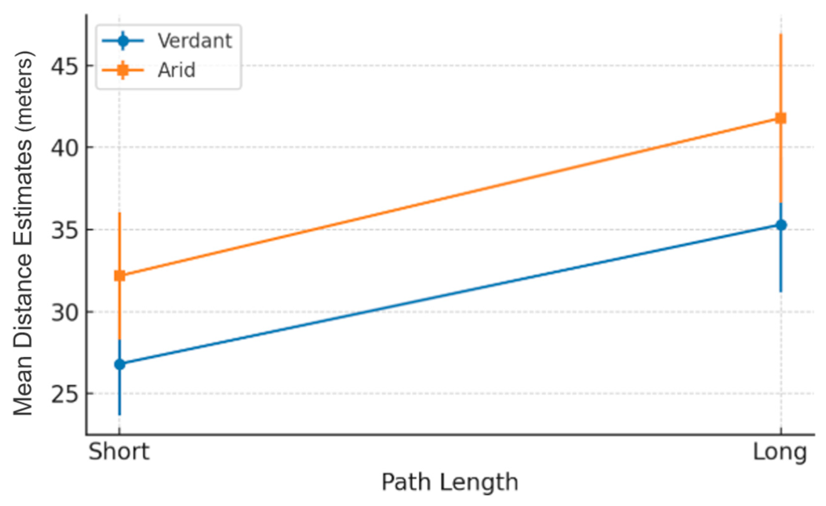 This finding can be interpreted in line with literature on action-based perception, according to which increased energetic costs, such as carrying loads or climbing slopes, make layouts appear longer or steeper [16,24]. In this case, participants did not expend more energy due to different metrics because the distances travelled were the same in both environments but presumably perceived the arid environment as requiring more effort. The effect therefore cannot be reduced to biomechanical load: ecological degradation itself acted as a cue of hardship, operating as a perceptual stressor.