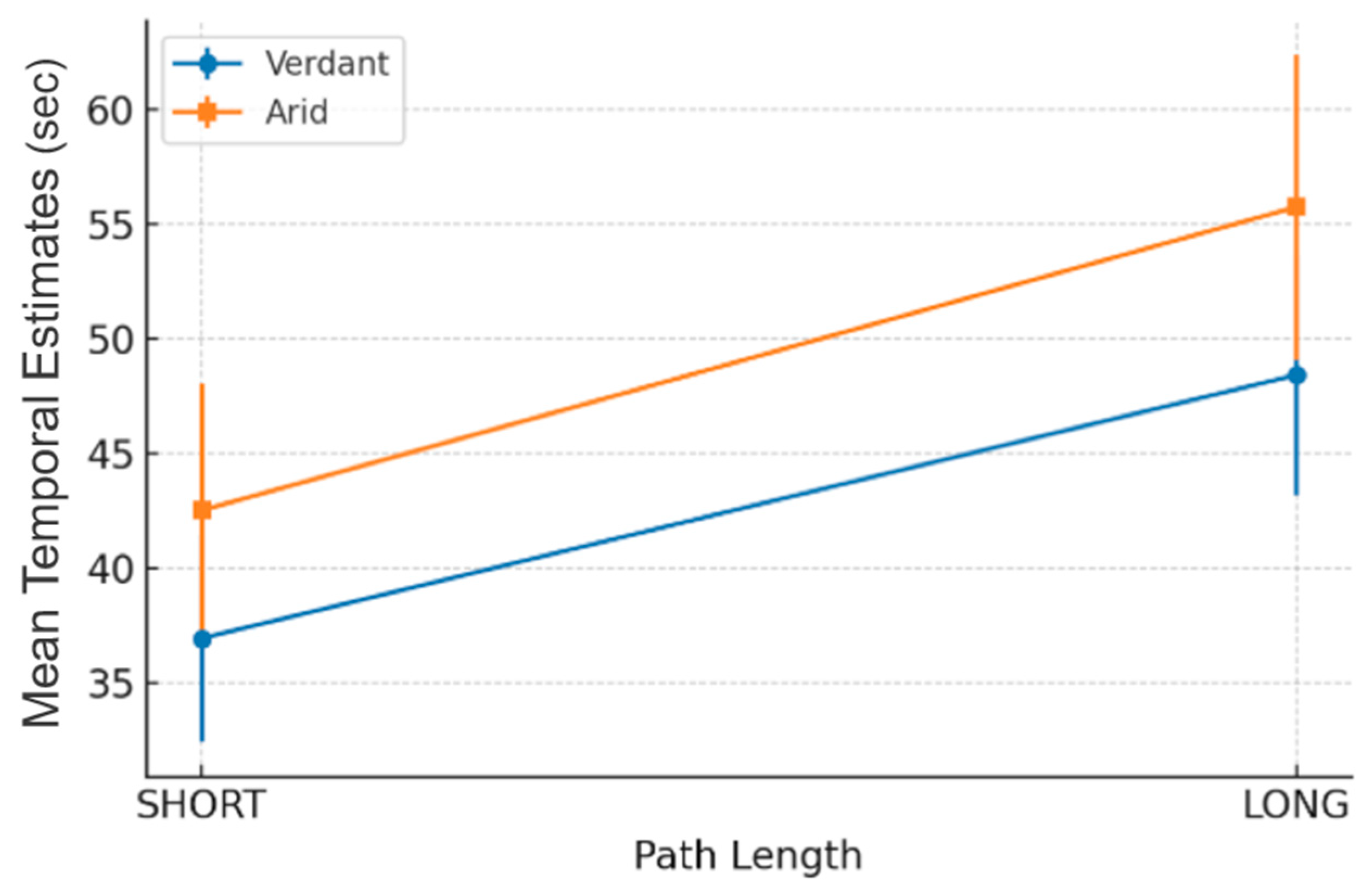 Time estimation: Results revealed a significant main effect of Environment, F(1, 34) = 4.46, p = 0.042, η2p = 0.12 (Cohen’s f = 0.37), with arid paths judged as taking a longer time (M = 49.13, SE = 5.60) than verdant paths (M = 42.66, SE = 4.65). There was also a significant main effect of Path Length, F(1, 34) = 19.19, p < 0.001, η2p = 0.36 (Cohen’s f = 0.75), with long paths estimated as taking more time (M = 39.71, SE = 4.79) than short ones (M = 52.09, SE = 5.42). The Environment × Path Length interaction was not significant, F(1, 34) = 0.09, p = 0.766, η2p = 0.003. See Figure 4.
