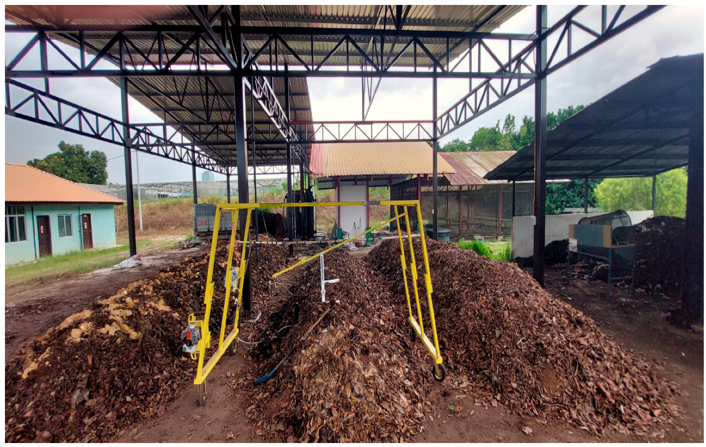 6]. Green residues served as a rapid nitrogen source, yellow leaves and sawdust provided structural carbon and improved aeration, horse manure contributed microbial inoculum and organic enrichment, and sludge water maintained optimal moisture and soluble nutrient content. The ratios represented various substrate compositions for performance comparison under controlled conditions.