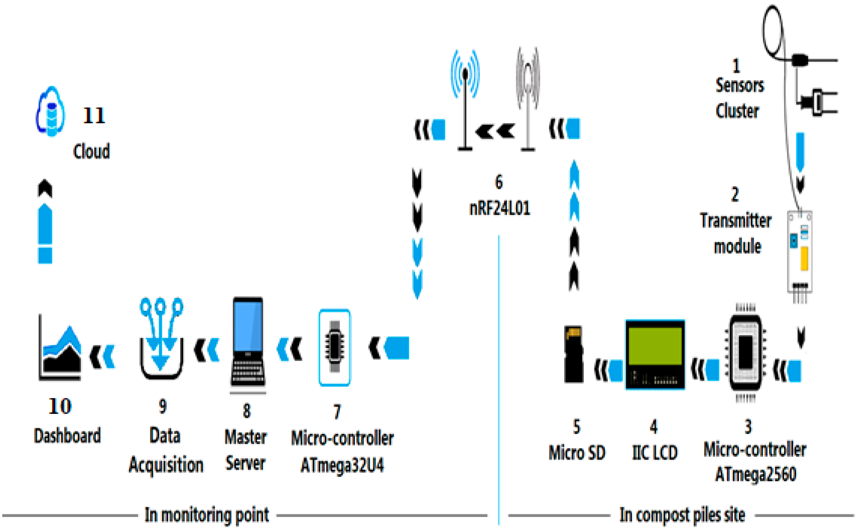 Figure 2 illustrates the integrated architecture of data flow, control logic, and modular expansion within the monitoring framework. The workflow encompassed two operational phases: initialization of sensors, variables, and wireless modules, followed by continuous acquisition, processing, display, logging, and wireless transfer. Data routed to the DAQ unit was reformatted for seamless integration with cloud-based analytical tools, enabling structured storage, secure access, and subsequent machine learning application. By linking low-level sensing with advanced analytics, the system established a closed-loop monitoring framework in which real-time comparisons against management thresholds supported timely interventions, such as turning or watering. Collectively, this approach enhanced the efficiency of composting operation, improved compost quality, and increased the overall reliability of tropical composting systems.