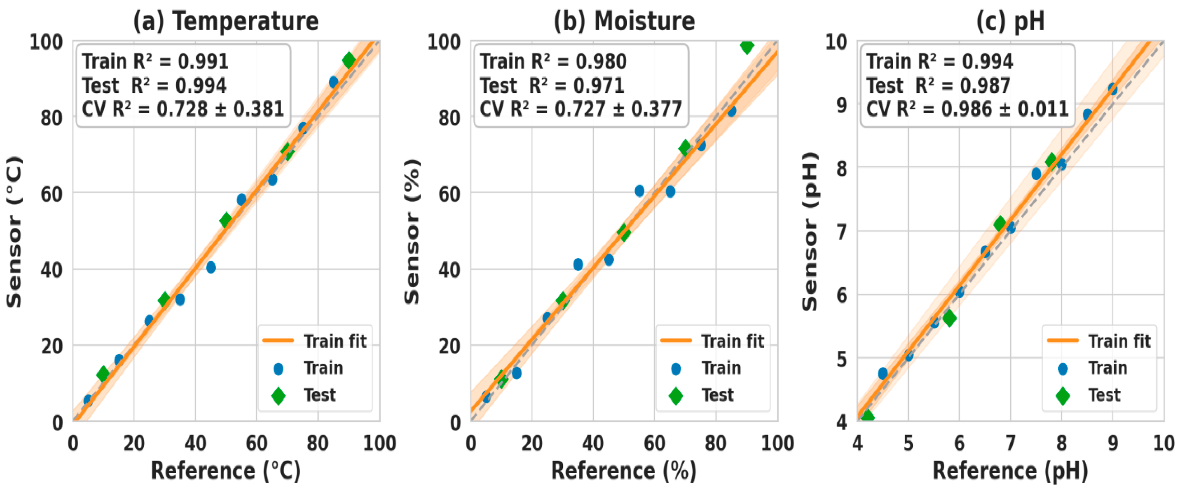 2 = 0.36 for temperature, 0.34 for moisture, and 0.29 for pH), while narrow 95% confidence intervals (±0.2 °C, ±1.0%, and ±0.05 pH units) reinforced reliability. Notably, whereas uncalibrated or unmonitored systems in the literature often report more than 10% unexplained variance across parameters, these validated results remained tightly bound within agronomic tolerances, underscoring a significant advance in monitoring precision. As summarized in