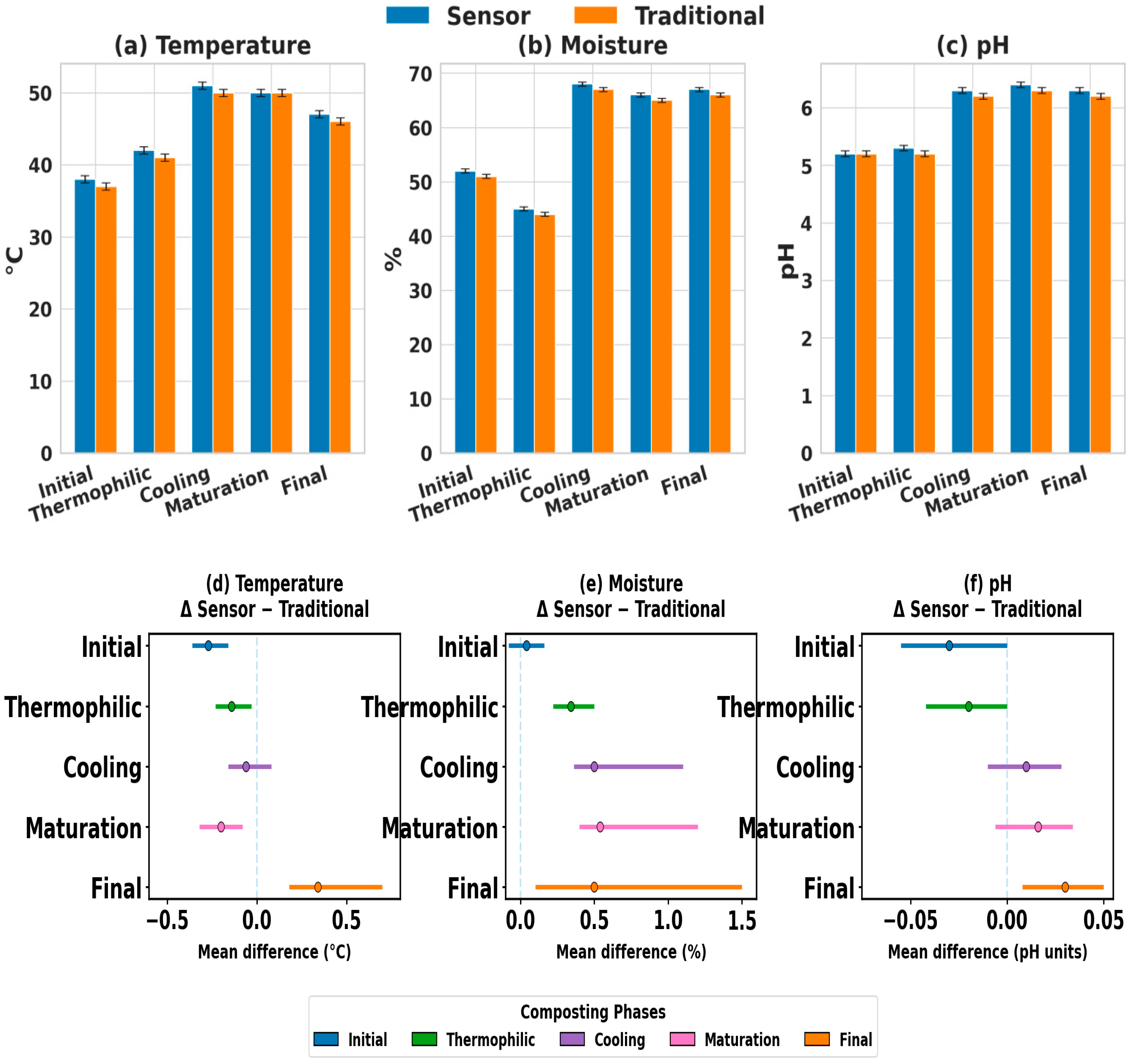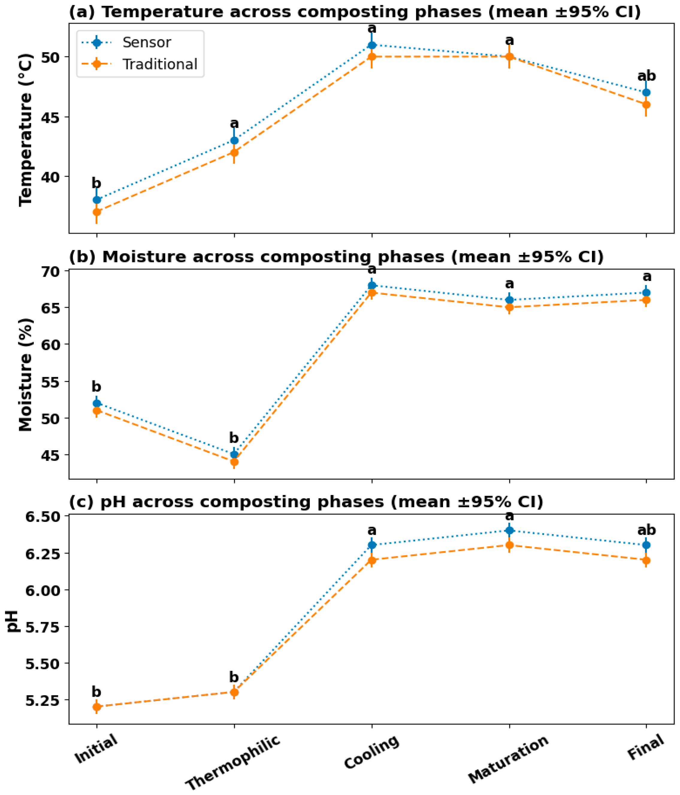 p < 0.001) in temperature, moisture, and pH across the initial, thermophilic, cooling, maturation, and the final phases, thereby reflecting the sequential biological and chemical transitions inherent to the composting process. Specifically, the thermophilic phase exhibited the sharpest temperature rise and the most significant moisture decline, indicative of peak microbial activity. Meanwhile, pH stabilization in later stages aligned with the neutralization of organic acids. Equally important, a comparative ANOVA between the sensor-based and traditional measurements yielded non-significant results (