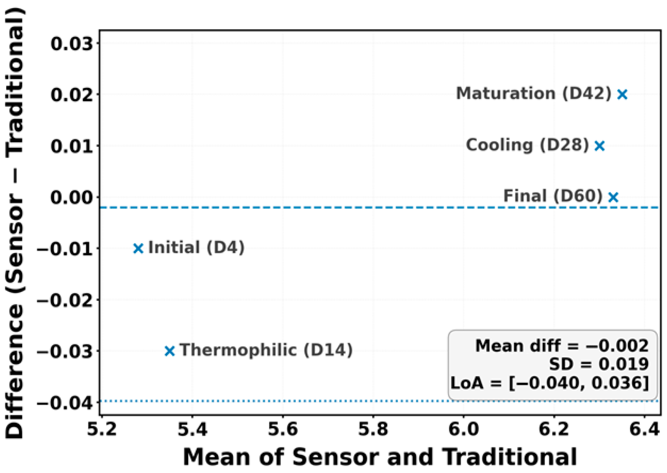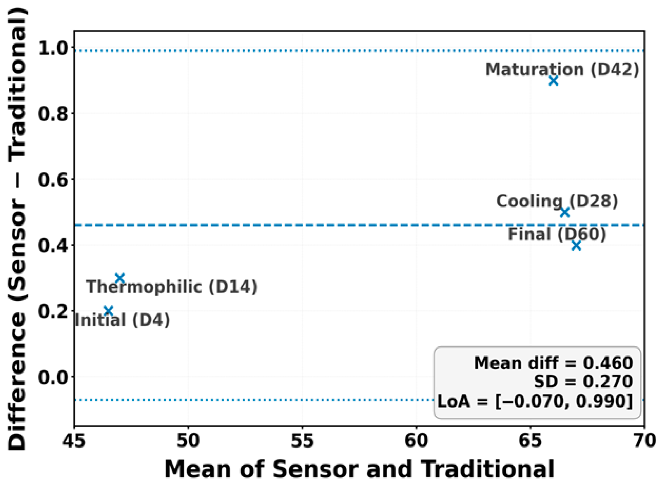 Figure 7) shows that the data points are tightly clustered around the zero-bias line, validating the sensor’s precision in monitoring compost stabilization.