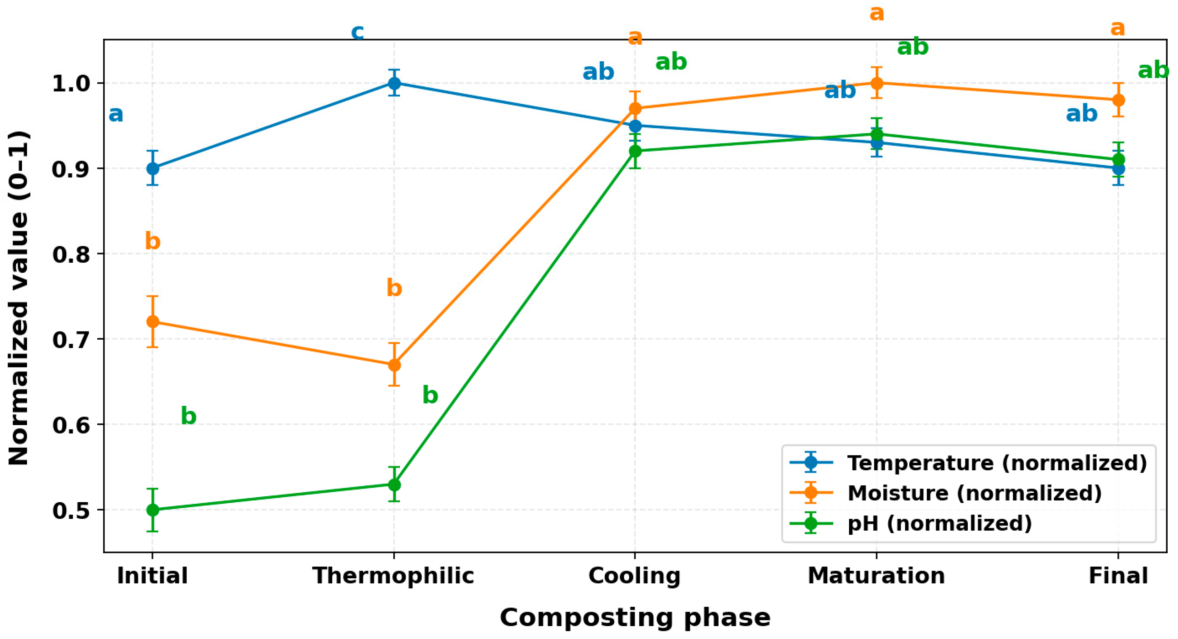 2 > 0.65 for temperature; >0.50 for moisture), which highlight the strong explanatory power of composting phase dynamics. Post hoc comparisons revealed that the most pronounced shifts occurred between the initial and thermophilic phases (
