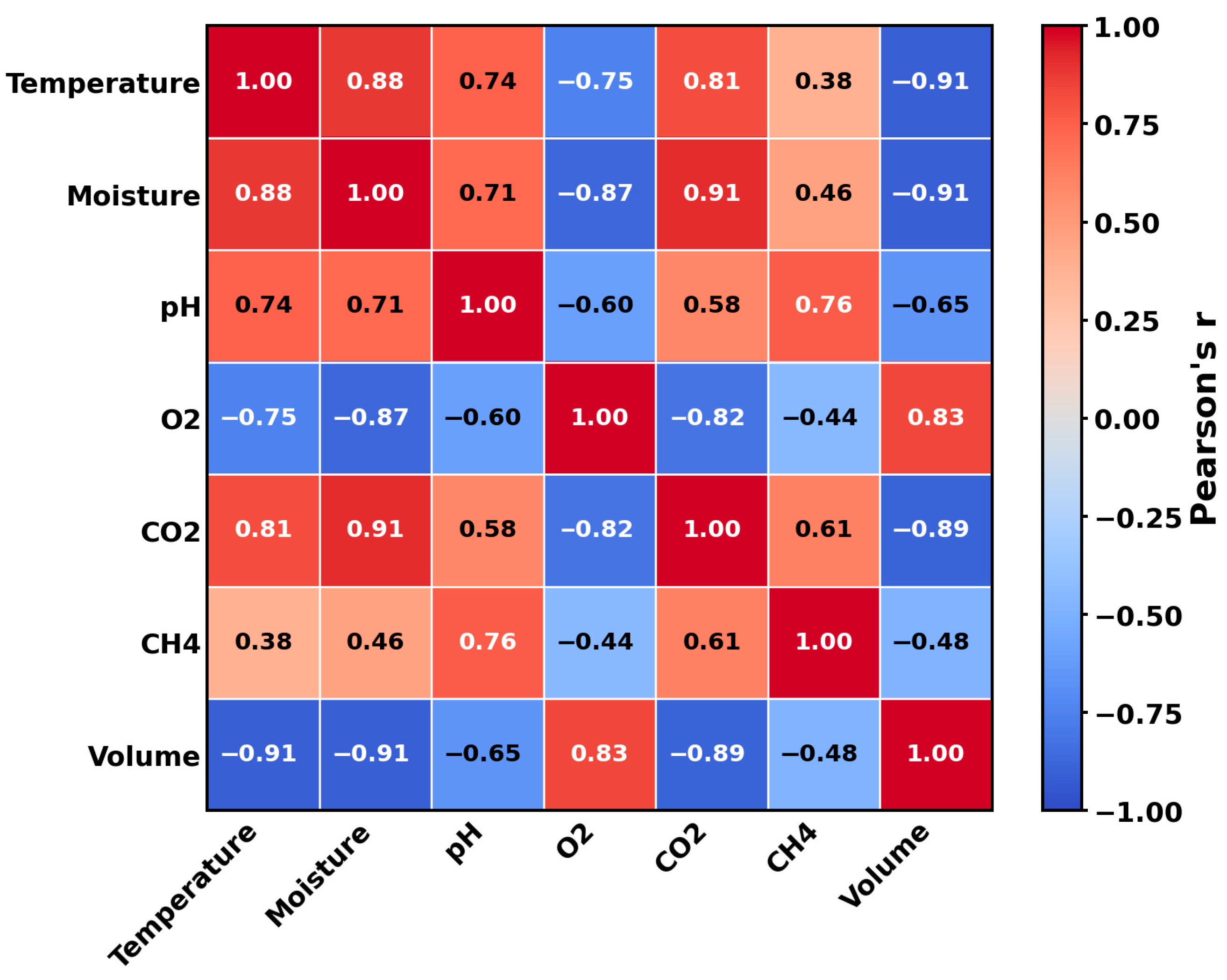 A Pearson correlation matrix was constructed for the temperature, moisture, pH, O