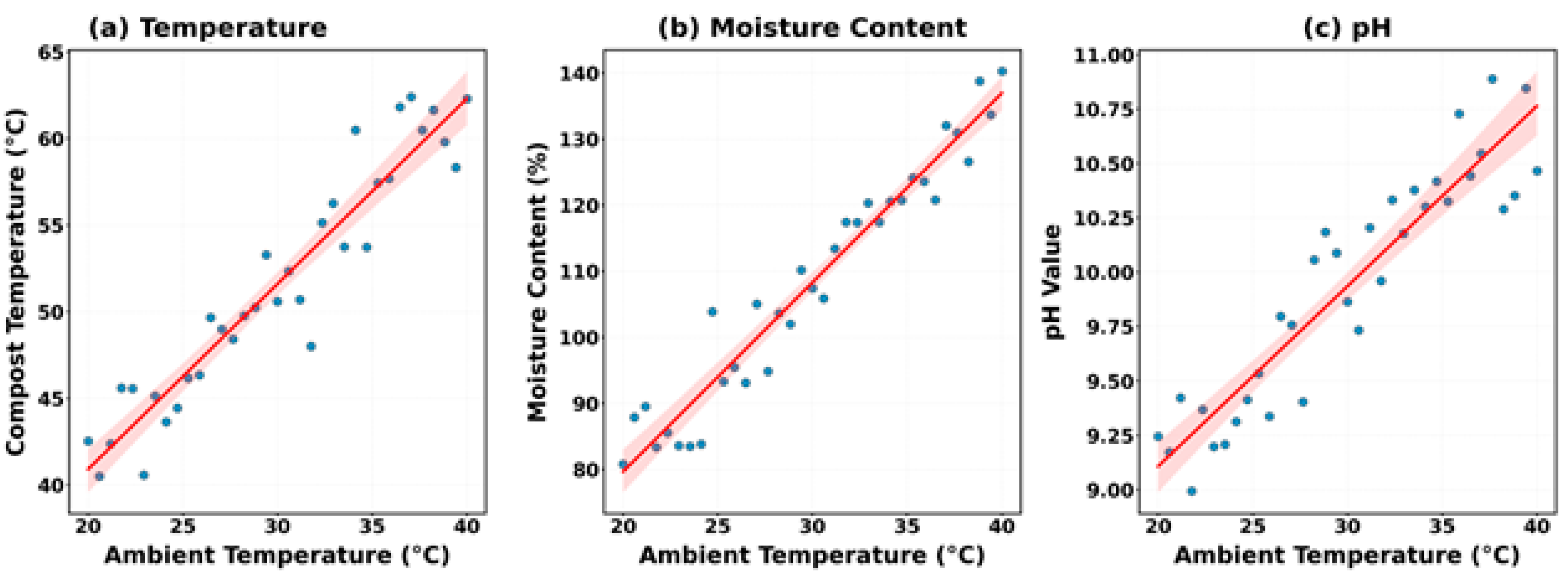 The impact of ambient temperature on the composting dynamic was evaluated through correlation and regression analyses, concentrating on the compost temperature, moisture content, and pH. Pearson’s correlation coefficients with 95% confidence intervals were computed, alongside linear regression models to quantify predictive relationships, with regression slopes (β) and coefficients of determination (R