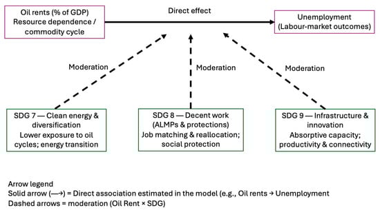 Figure 1 summarises the study’s logic: oil-rent cycles affect unemployment directly, while three SDG channels moderate this link—(i) institutional buffering under SDG 8 (better matching, reduced segmentation, basic protections/intermediation), (ii) diversification and innovation under SDGs 7 and 9 (clean-energy deployment, infrastructure and industrial upgrading that expand non-oil activity), and (iii) social policies and ALMPs under SDG 8 (training, placement, targeted wage support) that sustain employment and incomes during downturns. These mechanisms imply that SDG progress should attenuate the sensitivity of unemployment to oil rents; accordingly, we test OilRent × SDG interactions in the empirical models. For identification clarity, we interpret the estimated interactions as conditional associations.
