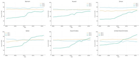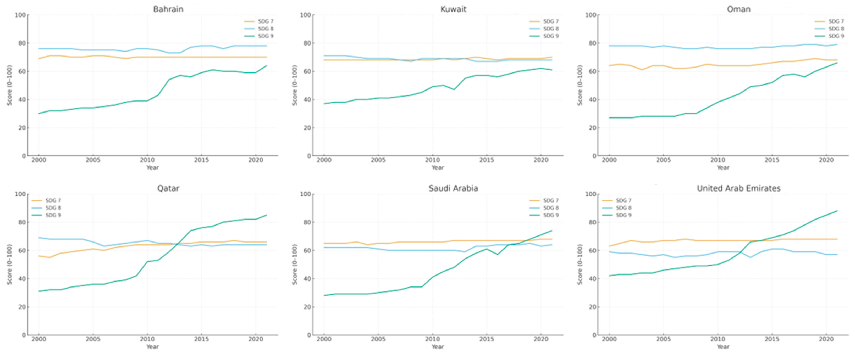 Dynamics of SDGs 7, 8, and 9 in GCC countries, 2000–2021. Notes: One panel per country; series are scaled 0–100. Source: Authors’ calculations from the Sustainable Development Report (SDSN), backcasted values prior to 2015.