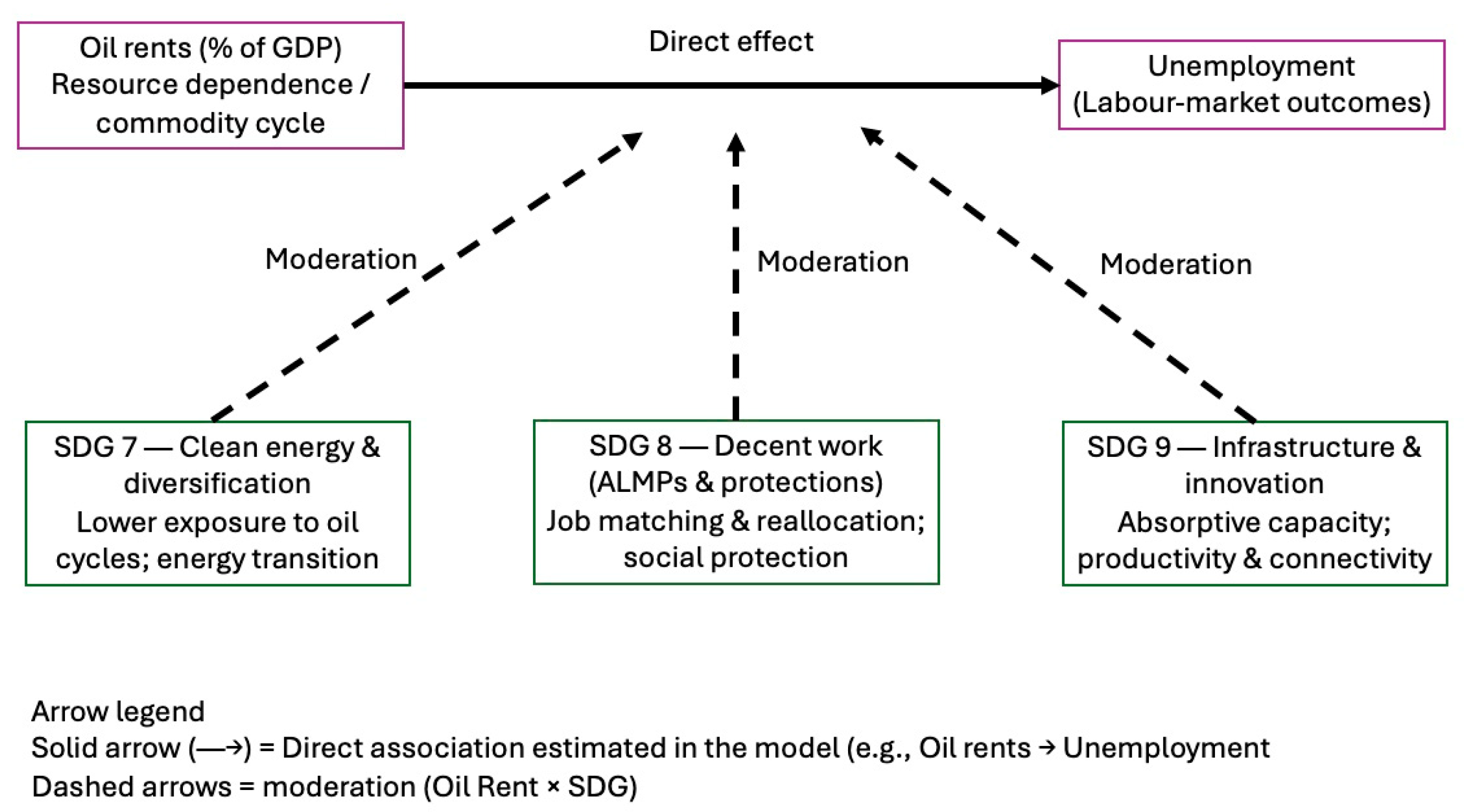 The Sustainable Development Goals (SDGs) provide a relevant framework in this context. While usually treated as long-term developmental targets, specific goals—such as SDG 7 (clean energy), SDG 8 (decent work), and SDG 9 (infrastructure)—are directly linked to economic resilience and structural transformation. By framing these goals as potential instruments of macroeconomic adjustment, it becomes possible to assess their role not only in advancing sustainability but also in mitigating cyclical vulnerabilities in rent-dependent economies. In oil-dependent labour markets, we treat SDGs as buffers: SDG 7 (clean energy) lowers exposure by diversifying the energy base, SDG 8 (decent work) dampens separations and raises job-finding through active labour-market programmes and social protection, and SDG 9 (infrastructure/innovation) increases absorptive capacity; this motivates our OilRent × SDG interaction tests.