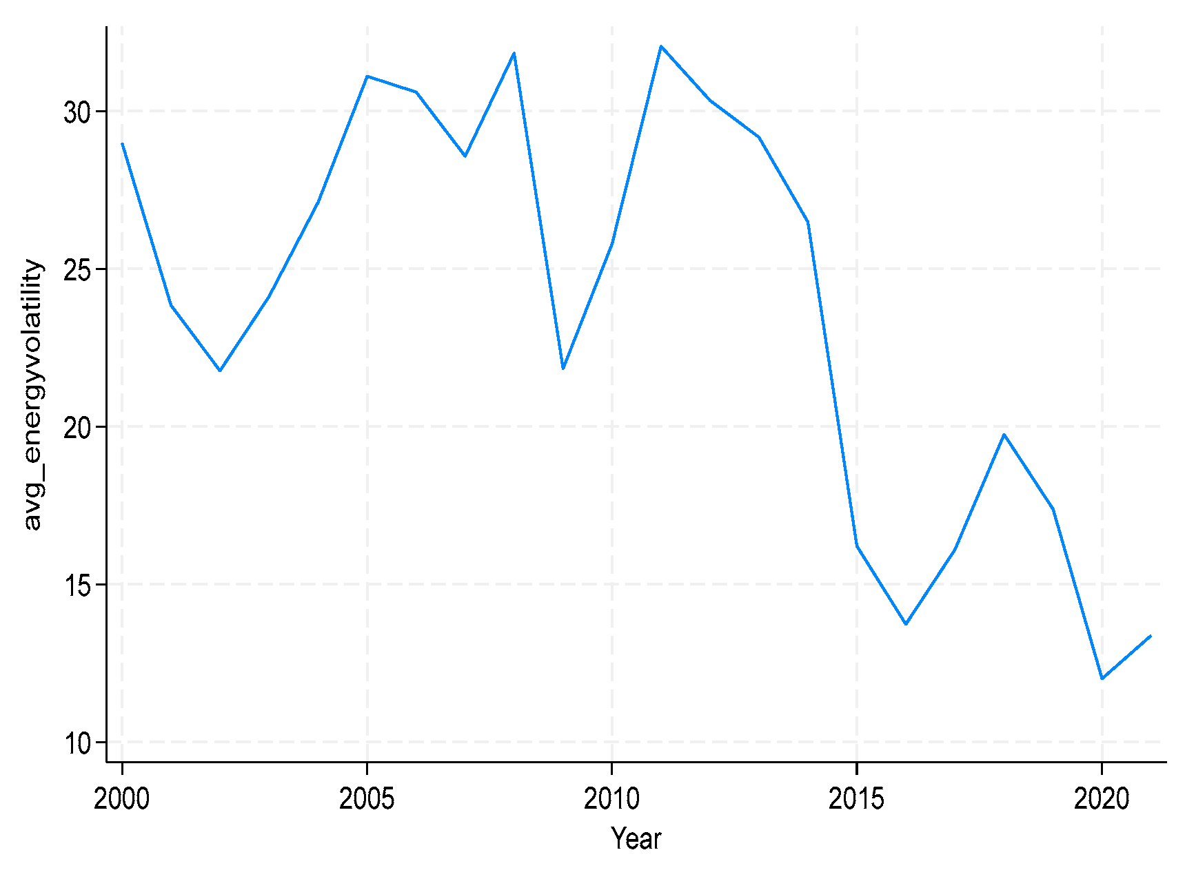 Figure 3 and Figure 4 illustrate key trends in unemployment and oil rent volatility, reinforcing the rationale for conditional modelling. Unemployment shows a general decline until 2019, followed by a sharp uptick in 2020. Meanwhile, oil rent volatility declines markedly after 2014, reflecting policy shifts and global energy price stabilization.