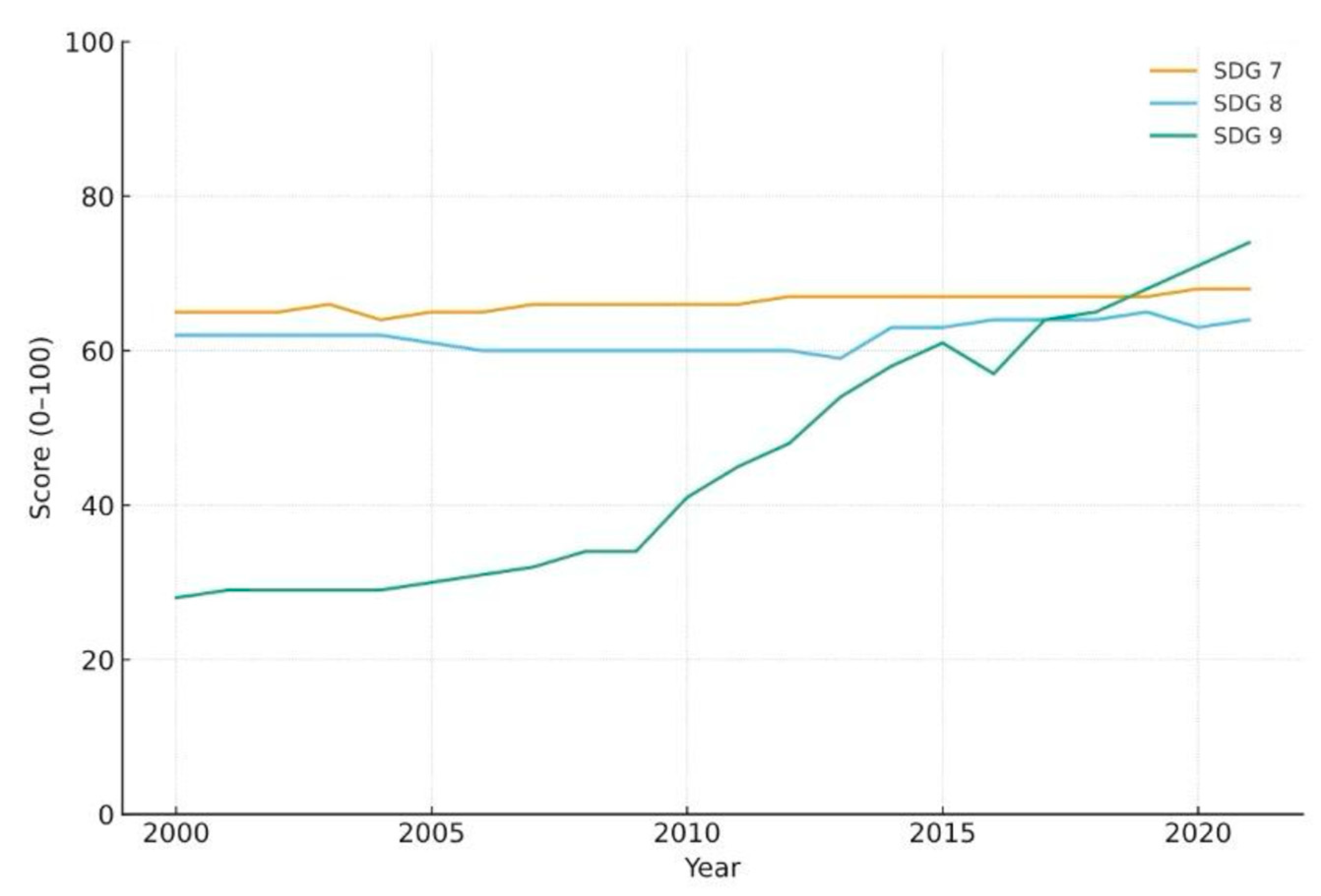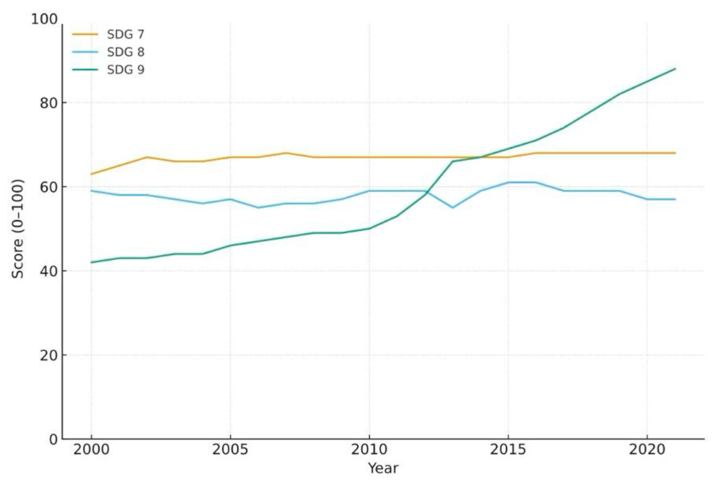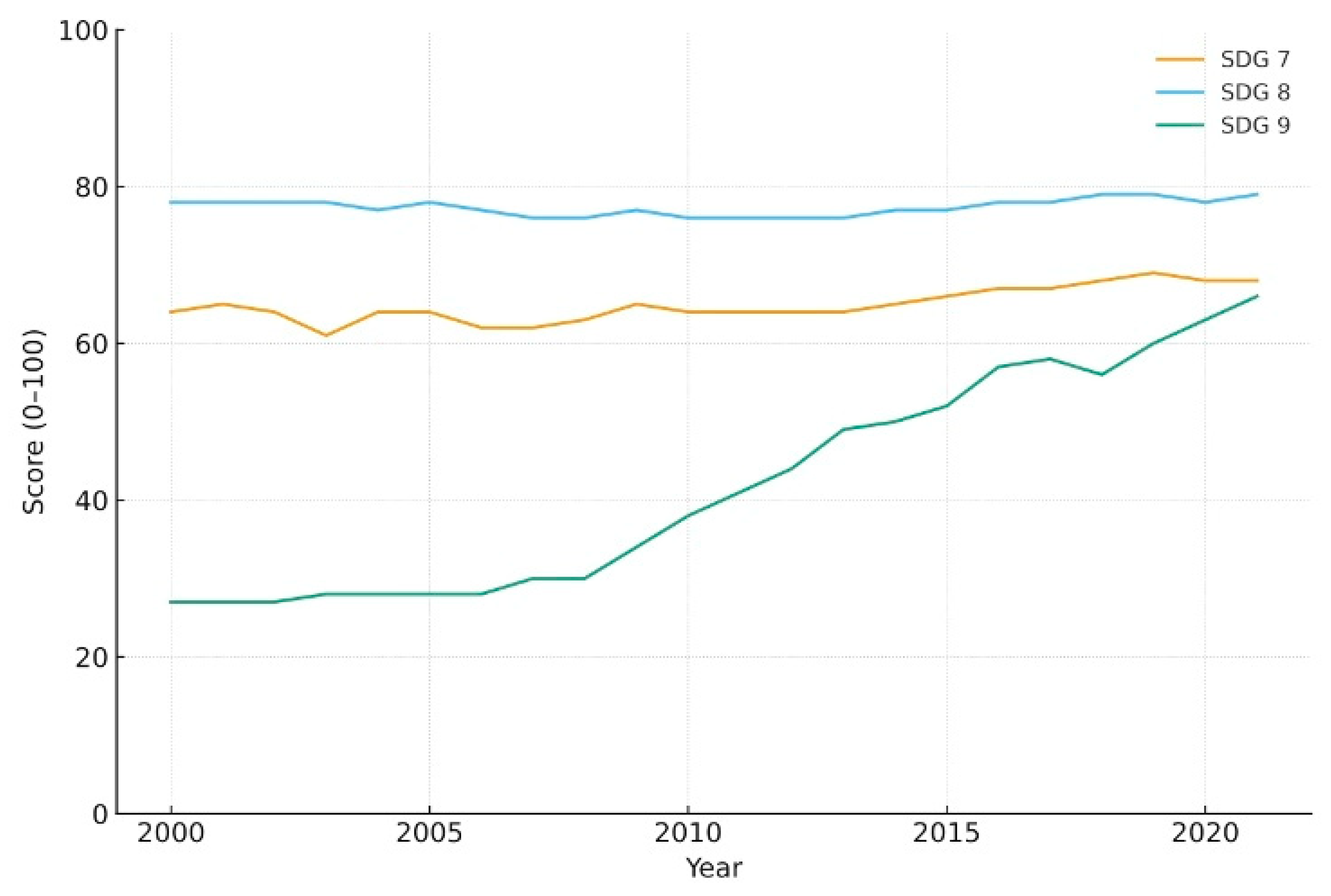Dynamics of SDGs 7, 8, and 9 in Saudi Arabia (2000–2021).