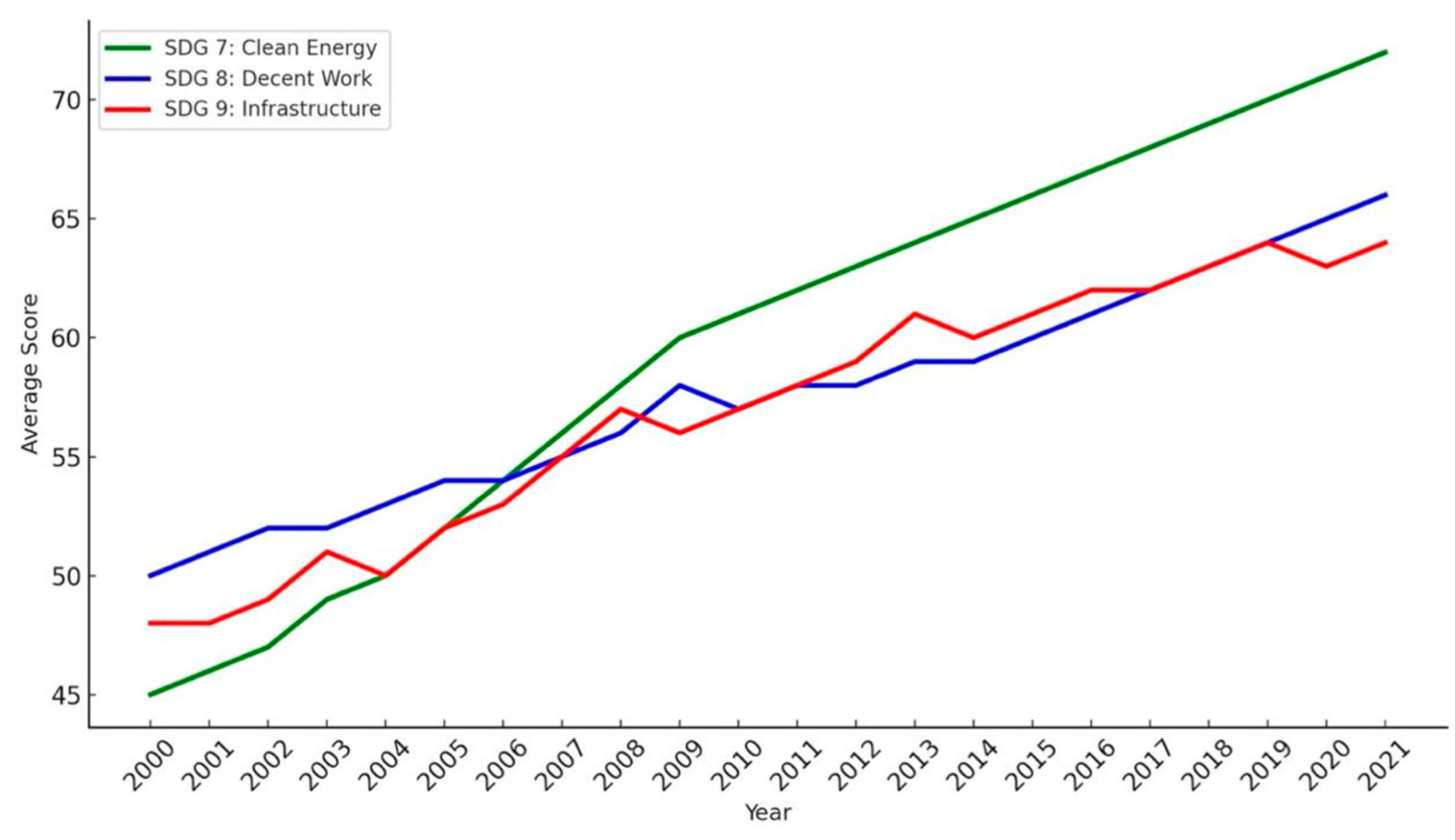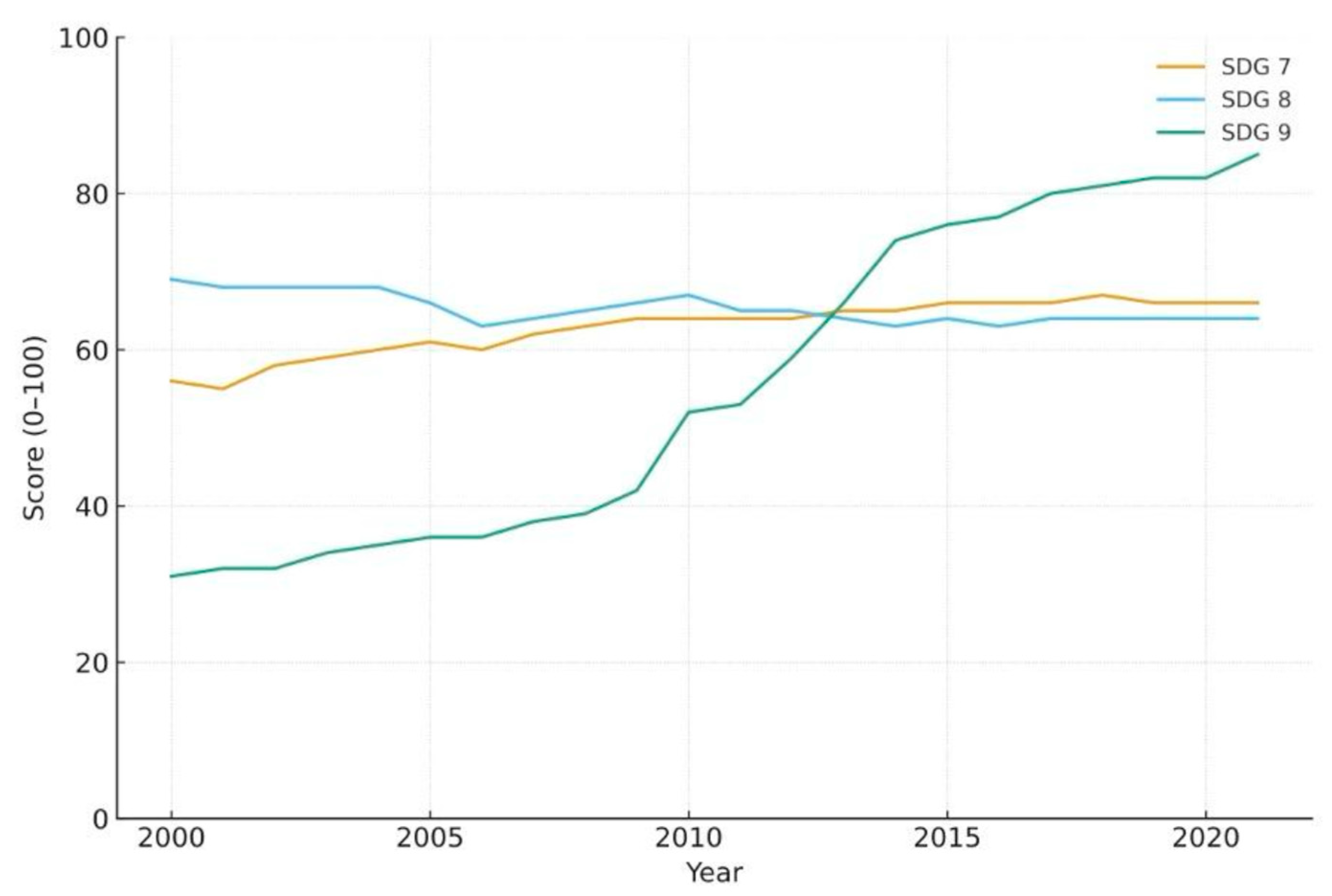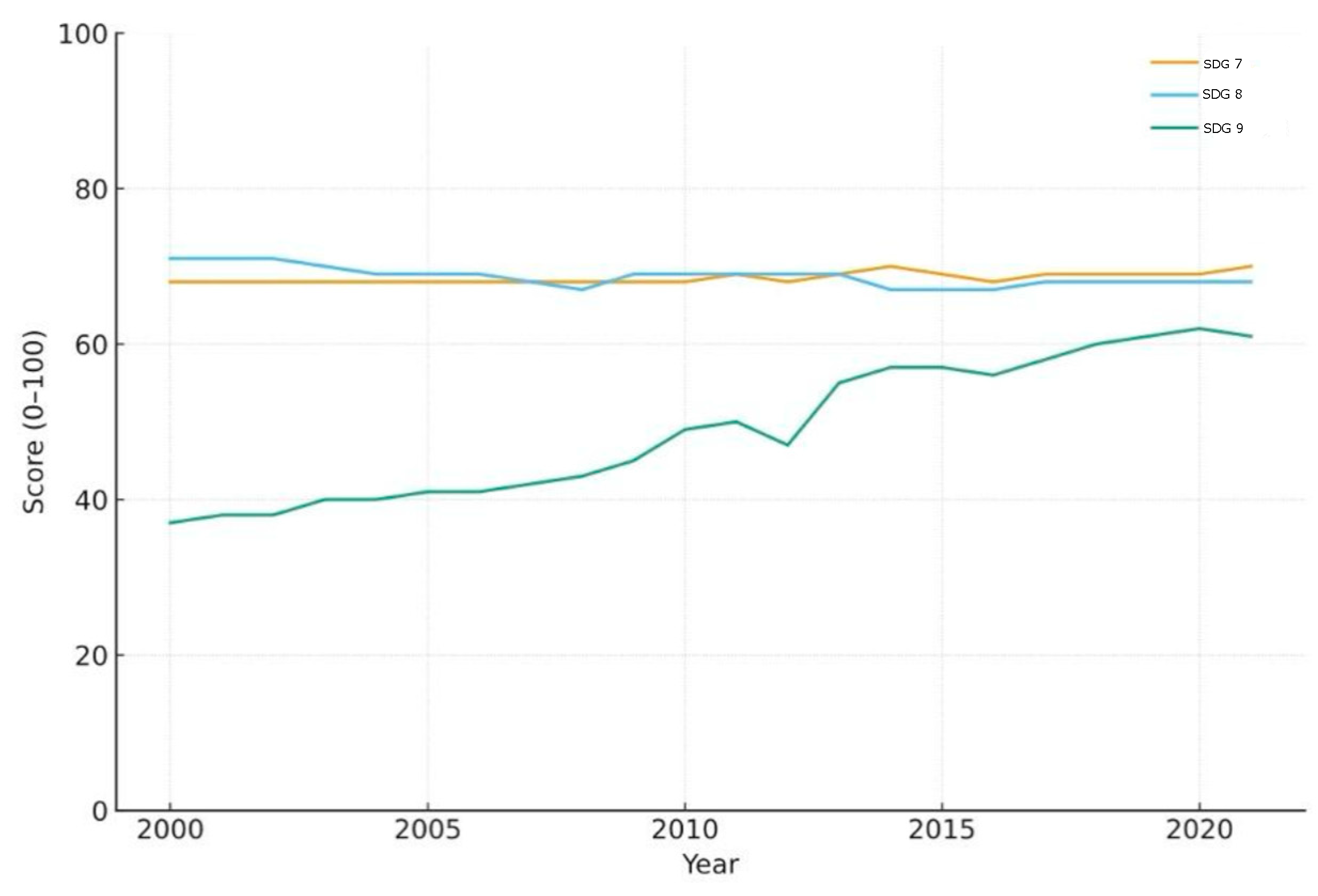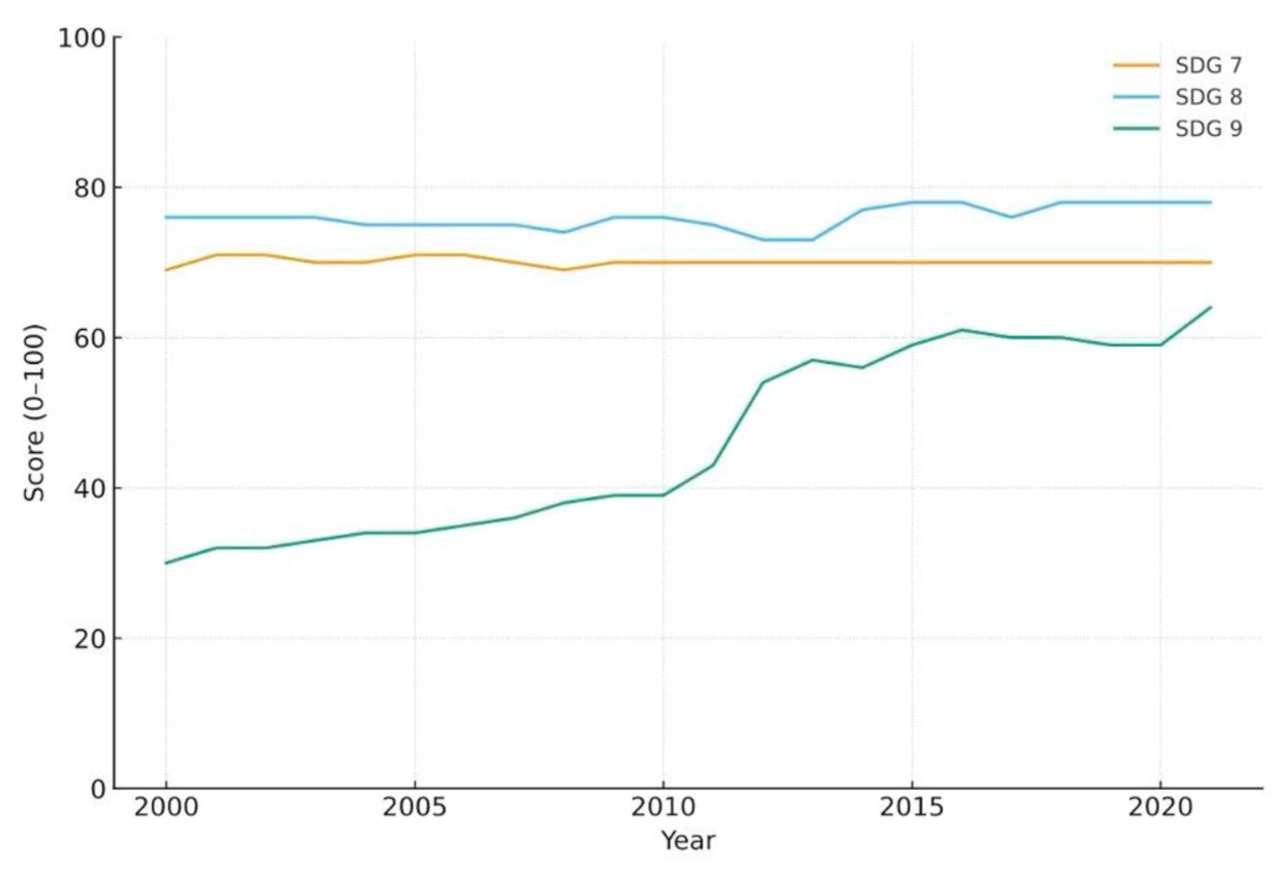 Dynamics of SDGs 7, 8, and 9 in Saudi Arabia (2000–2021).