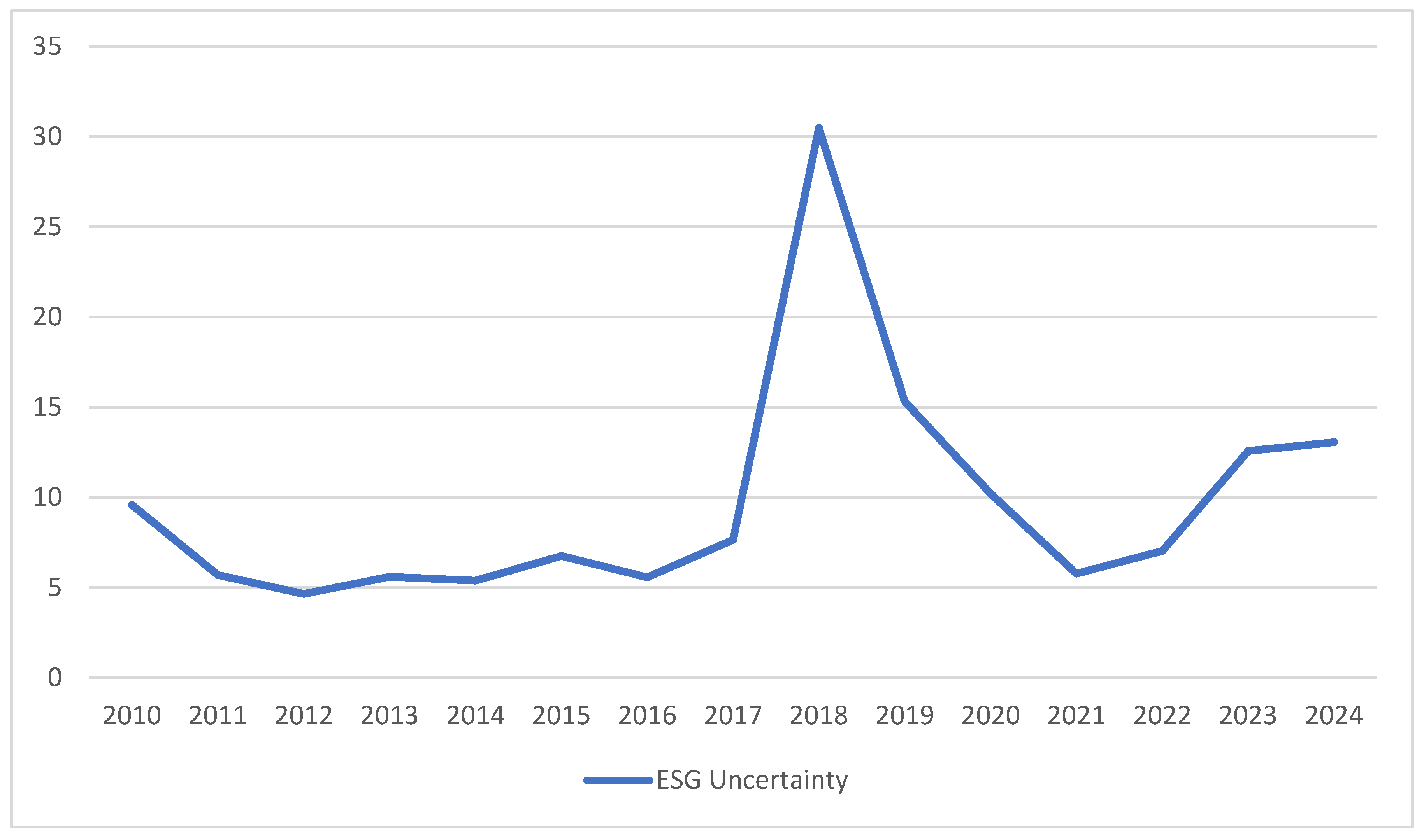 Figure 1 illustrates the trend of ESG uncertainty from 2010 to 2024. The figure shows that ESG uncertainty remained relatively low and stable until 2016, followed by a sharp surge in 2018, likely reflecting heightened regulatory debates and the introduction of new sustainability disclosure frameworks in China. After peaking in 2018, uncertainty declined as firms adapted to evolving ESG standards, though a moderate rise after 2022 indicates renewed policy discussions and tightening sustainability requirements. Overall, the trend reflects the evolving and dynamic nature of ESG regulation and its implications for firms’ operational decision-making.