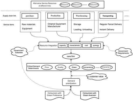 The lead firm, positioned at the strategic core of this ecosystem, faces a dual task: ensuring demand alignment by allocating resources to meet the varied green preferences of consumers, and achieving circular efficiency by optimizing resource utilization, reducing environmental impact, and ensuring the sustainability of all supply chain members. As illustrated in Figure 2, strategic resource integration depends on aligning consumer green preferences with the capabilities of supply chain links.