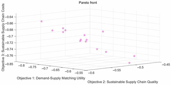 To evaluate the practical value of integrating consumer green preferences and government intervention in SSC optimization, a comparative study was conducted under two operational configurations: considering consumer green preference only (without government subsidies) and considering neither factor (baseline scenario). Figure 6 illustrates the distinct Pareto solutions derived from the multi-objective optimization model under these configurations, highlighting significant variations in the optimal resource portfolio.