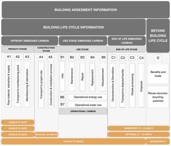 Reducing greenhouse gas (GHG) emissions to mitigate anthropogenic impacts is a global priority. Sustainable measures, such as decarbonisation and circularity strategies, are being implemented within the construction industry to address some of these challenges. The European Union (EU) targets a 50% reduction in emissions in the building and construction sector by 2030, aiming for an economy with net-zero GHG emissions by 2050. This objective is at the heart of the European Green Deal and is legally mandated by the European Climate Law. A noteworthy strategy in this context involves the transition to net-zero carbon buildings (nZCBs), which has been widely recognised as a promising solution to energy and environmental problems, given that they offer significant advantages in energy efficiency and the reduction of carbon emissions [,]. Unlike net-zero energy buildings (nZEBs), nZCBs focus on achieving net-zero carbon emissions throughout a building’s entire life cycle. Net-zero carbon emissions are made up of embodied carbon (EC) (further divided into upfront and whole-life embodied carbon) and operational carbon (OC) (resulting from the emissions linked to operational energy (OE) and water use). Figure 1 illustrates the scopes and life cycle stages, as defined by European standards such as EN 15978:2011 [].
