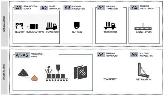 The life cycle stages addressed include quarrying raw materials (A1), transport to the manufacturing site (A2), manufacturing process (A3), delivery to the building site (A4) and installation (A5) (Figure 3).