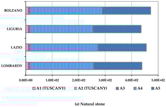 Nevertheless, the cradle-to-gate approach adopted in the Arcadia project excludes several essential downstream phases—specifically, distribution to construction sites (A4) and their on-site installation (A5)—which are crucial for a comprehensive environmental assessment of natural stone use in architecture. These phases are particularly important in Italy, where the extraction and processing of natural stone are concentrated in geographically localised quarrying districts, typically situated near major mining sites. Tuscany, Lombardy and the Province of Trento are the regions with the highest extraction volumes—collectively contributing approximately 54.2% of national production—followed by Lazio and Sardinia.