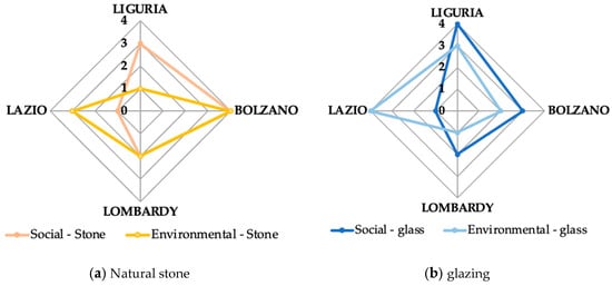 Within all material streams contributing to EC in buildings, this study focuses on natural stone and glass. Traditionally regarded as foundational materials in architectural history, stone and other lithic resources continue to play a significant role in contemporary construction. The stone industry has considerable economic significance both in Italy and globally, contributing to local production systems and employment capacities, particularly in specialised geographical areas []. Owing to the presence of highly specialised quarrying districts and a diverse lithological resource base, Italy retains a strategic role in the production and exportation of stone materials. According to the 2021 national survey, there are 4168 authorised quarrying sites across the country, with approximately 25% integrated into the natural stone supply chain. Annual extraction volumes reach 6.2 million cubic meters, most of which are used in the construction sector [].