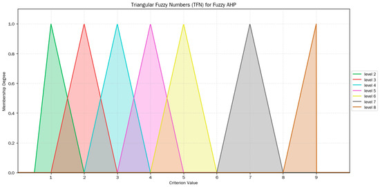 represents a triangular fuzzy number that is widely used in describing unquantifiable indicators [42], where is the lower bound of the triangular fuzzy number, is the upper bound of the triangular fuzzy number, and is the median value of the triangular fuzzy number. and denote the range of the importance relationship between two indicators being compared, while denotes the importance relationship between the two indicators. The corresponding meanings of the fuzzy scales (Table 2) and visualization (Figure 2) are as follows.