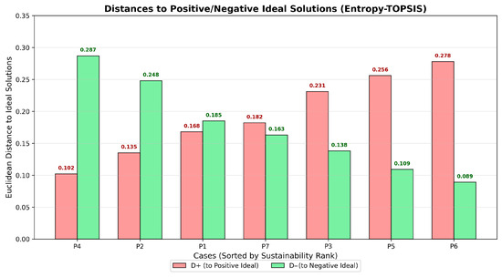Subsequently, we used the weights obtained via the entropy weight method as the weight matrix and applied the original TOPSIS to derive the superiority–inferiority rankings of the seven regions, as well as their respective distances to the ideal solutions (Figure 10). The calculated results of the schemes (Table 14) and their visualizations (Figure 11) are presented below.