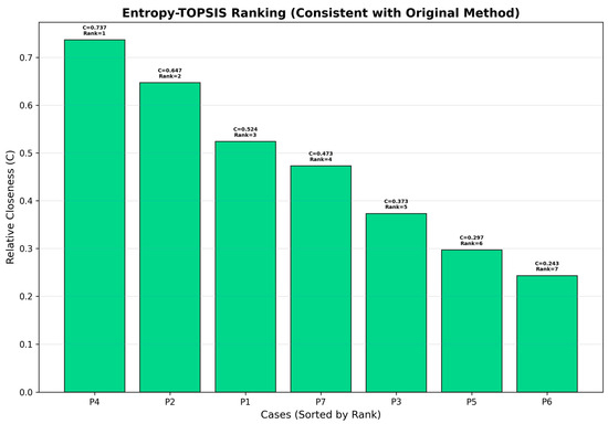Compared with Figure 8, the ranking results from Entropy-Weight TOPSIS are consistent with those obtained by the proposed FAHP-GR-TOPSIS in this study. Moreover, the preference for indicators can also be observed in the weight comparison (see Table 13). Experimental verification shows that the weights derived from expert judgments in FAHP-GR-TOPSIS and the results are almost consistent with those of the fully objective Entropy-Weight TOPSIS—proving that this innovative method has almost no difference from traditional objective methods in terms of ranking accuracy.