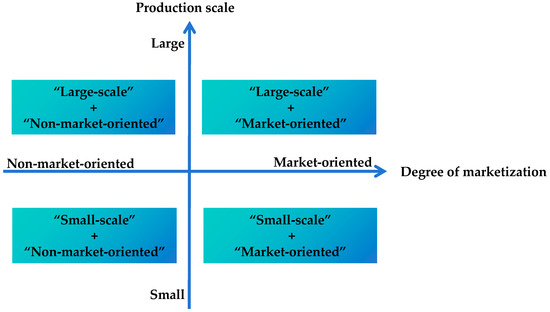 To discuss the distinguishing characteristics of different equilibria and focus on classifications of marketization in economics, an analytical framework based on “production scale” and “degree of marketization” is introduced. “Small-scale” and “large-scale” characterize industry production scale. “Market-oriented” and “non-market-oriented equilibrium points” denote two distinct states in which stability is achieved primarily through market mechanisms or non-market factors, respectively. As shown in Figure 2, the purpose of the evolutionary simulation is to advance the energy utilization of straw and to establish a mature and scaled market. This framework facilitates assessment of the potential industry scale and degree of marketization under different policy instruments and thereby gives policy implications.