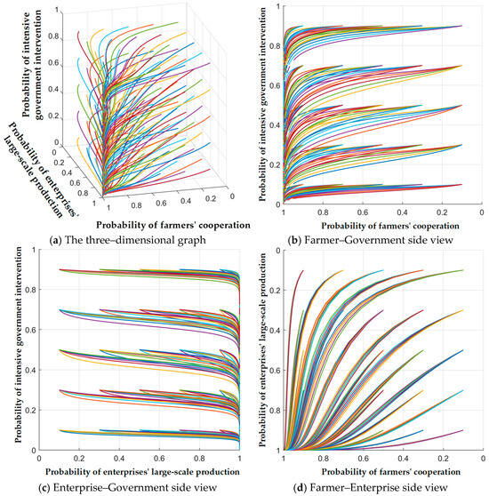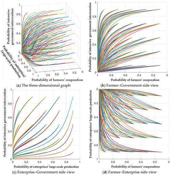 Scenario 3. When , the system’s evolutionary strategy is , where farmers choose cooperation, biomass enterprises maintain small-scale production, and the government performs intensive intervention.
