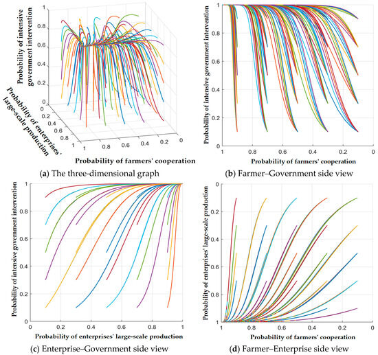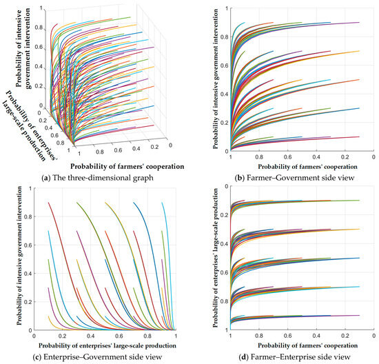 Scenario 4. When , the system’s evolutionary strategy is E8 (1, 1, 1), where farmers take cooperation, biomass enterprises adopt large-scale production, and the government continues intensive intervention.