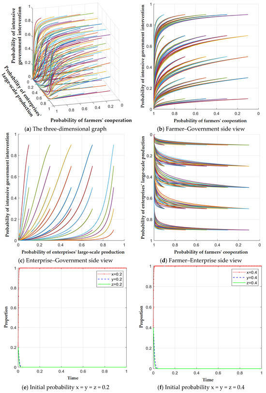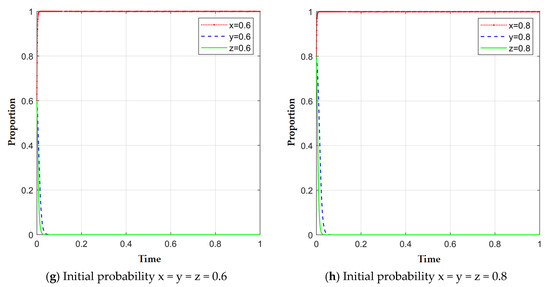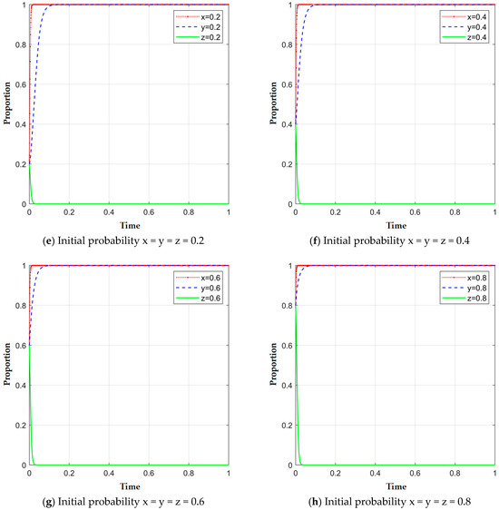 For numerical simulation, the specific parameters for each equilibrium are set as follows, E2: = 220, = 120, = 20, = 90, = 120, = 30, = 15, = 50, = 50, = 5, = 20, = 10, = 20, = 0.8, = 0.2, = 10, = 5, = 3, = 5; E5: = 220, = 50, = 3, = 90, = 120, = 40, = 10, = 50, = 50, = 5, = 20, = 10, = 20, = 0.8, = 2, = 8, = 5, = 3, = 5; E6: = 120, = 90, = 18, = 80, = 80, = 30, = 20, = 30, = 40, = 30, = 15, = 5, = 20, = 0.8, = 0.7, = 8, = 0.5, = 0.3, = 50; E8: = 120, = 60, = 3, = 40, = 60, = 20, = 6, = 30, = 40, = 30, = 15, = 5, = 12, = 0.8, = 0.7, = 20, = 6, = 0.3, = 50. The strategy choices of the tripartite game participants are obtained. The only stable points of each equilibrium in the game system are E2 (1, 0, 0), E5 (1, 1, 0), E6 (1, 0, 1), and E8 (1, 1, 1), respectively. Regardless of the initial willingness values of the participants, the ultimate evolution of systems for equilibrium E2 (1, 0, 0) will be towards the “cooperation”, “small-scale production”, and “weak intervention”, E5 (1, 1, 0) to the “cooperation”, “large-scale production”, and “weak intervention”, E6 (1, 0, 1) towards the “cooperation”, “small-scale production”, and “intensive intervention”’cooperation’, and E8 (1, 1, 1) to the “cooperation”, “large-scale production”, and “intensive intervention”.