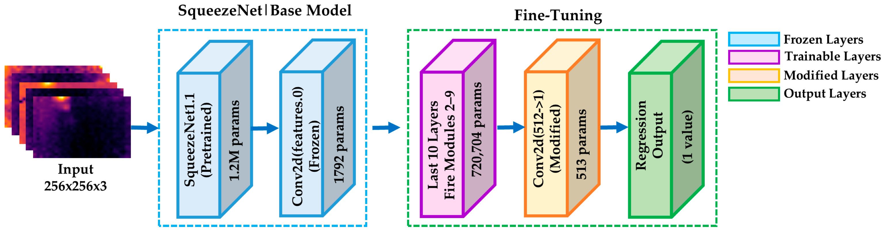 - The implementation of SqueezeNet v1.1 retained the frozen initial convolutional layer to preserve low-level feature extraction, while fine-tuning all subsequent layers. After adapting it to the regression task, the final model contained 723,009 parameters, of which 721,217 were trainable and 1792 remained frozen. Fine-tuning focused on the last ten layers, corresponding to Fire modules 2 through 9 and the final convolutional layer.