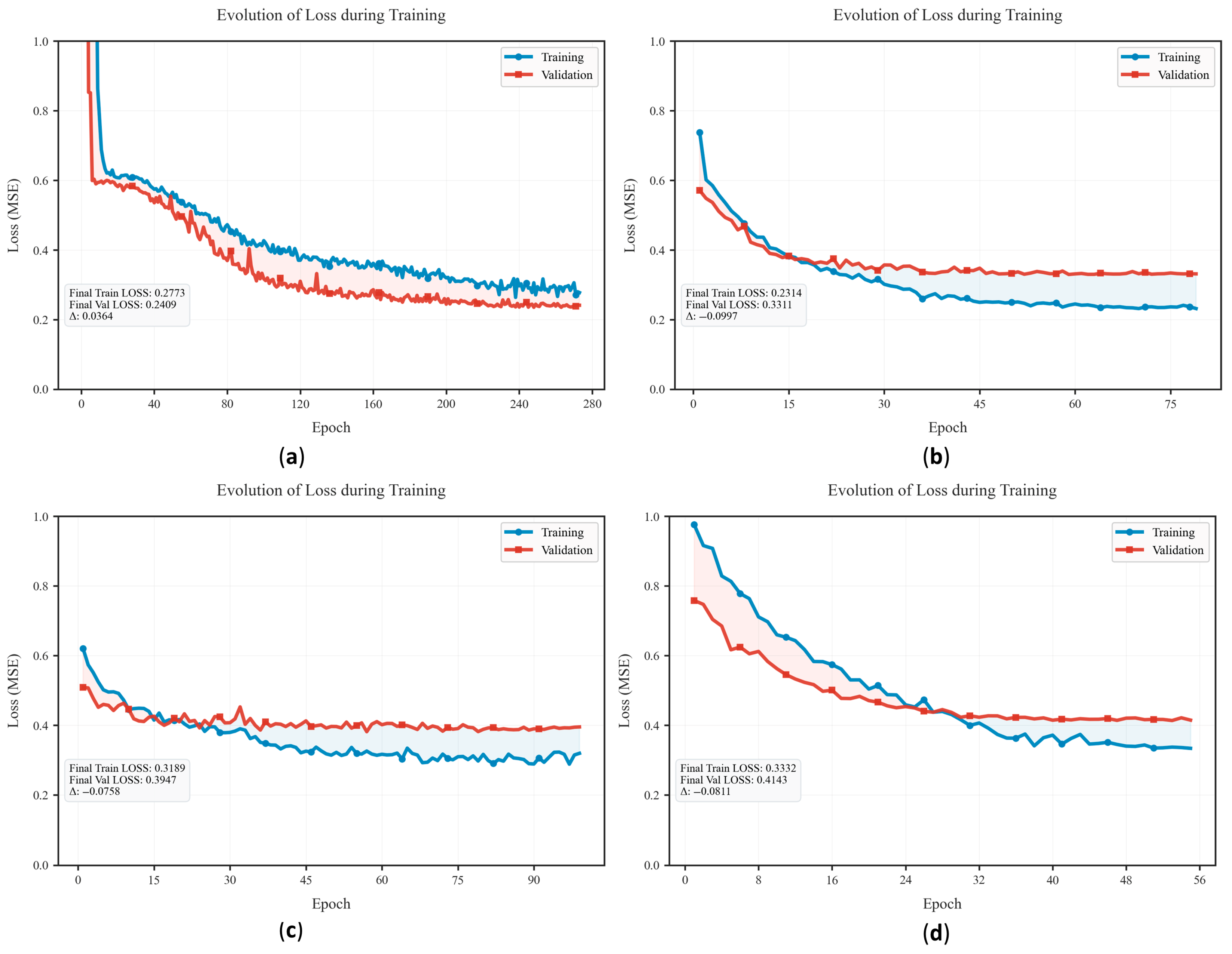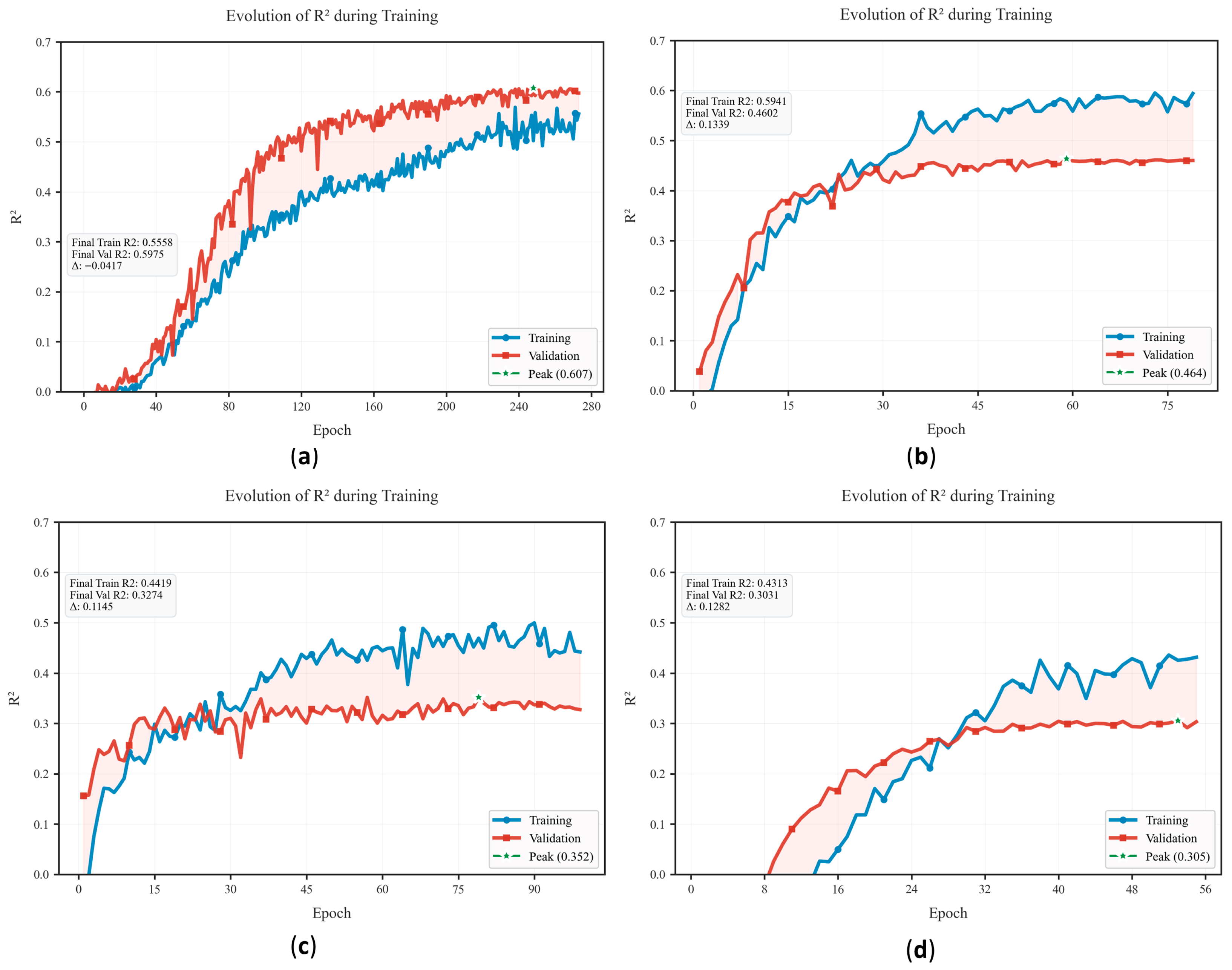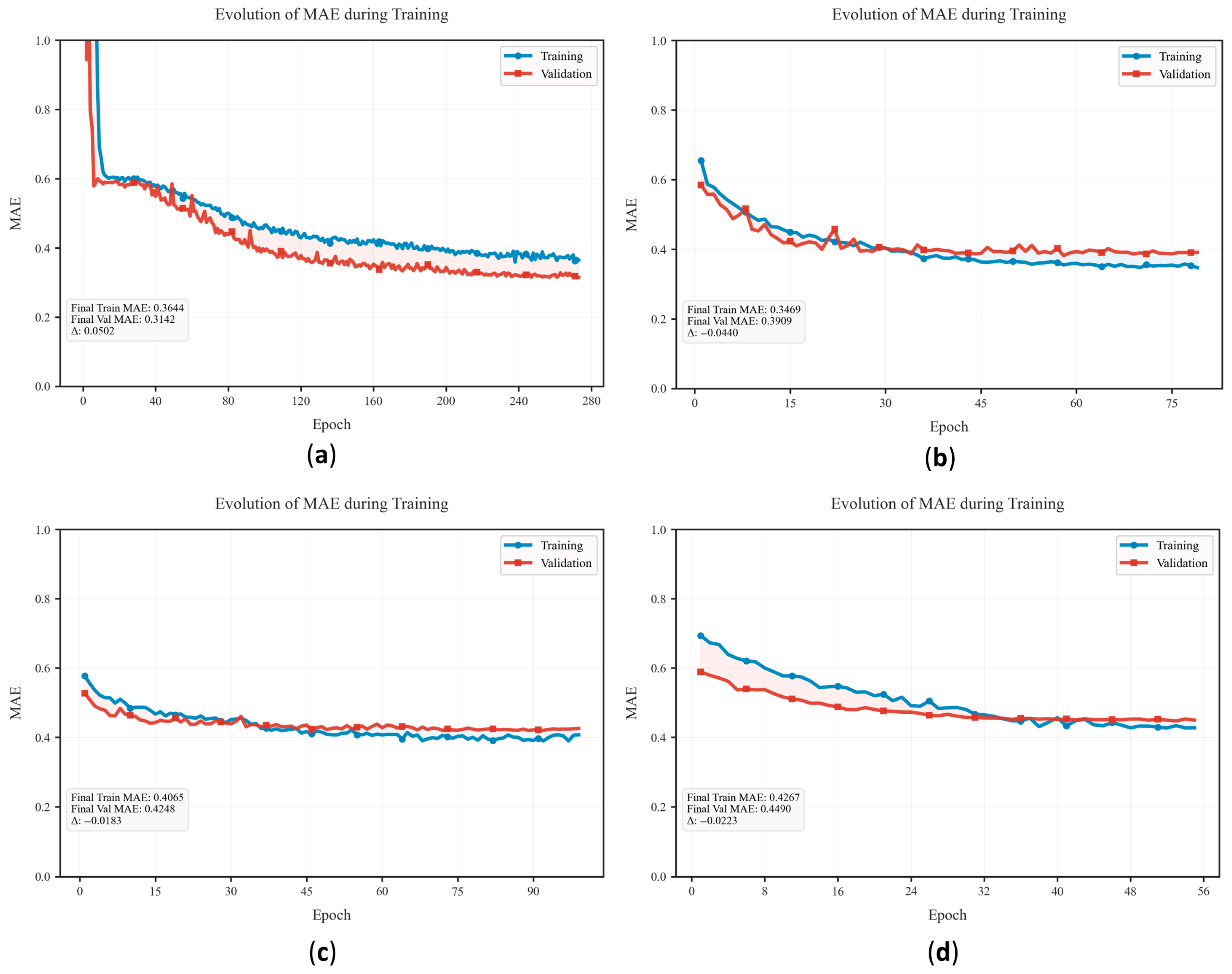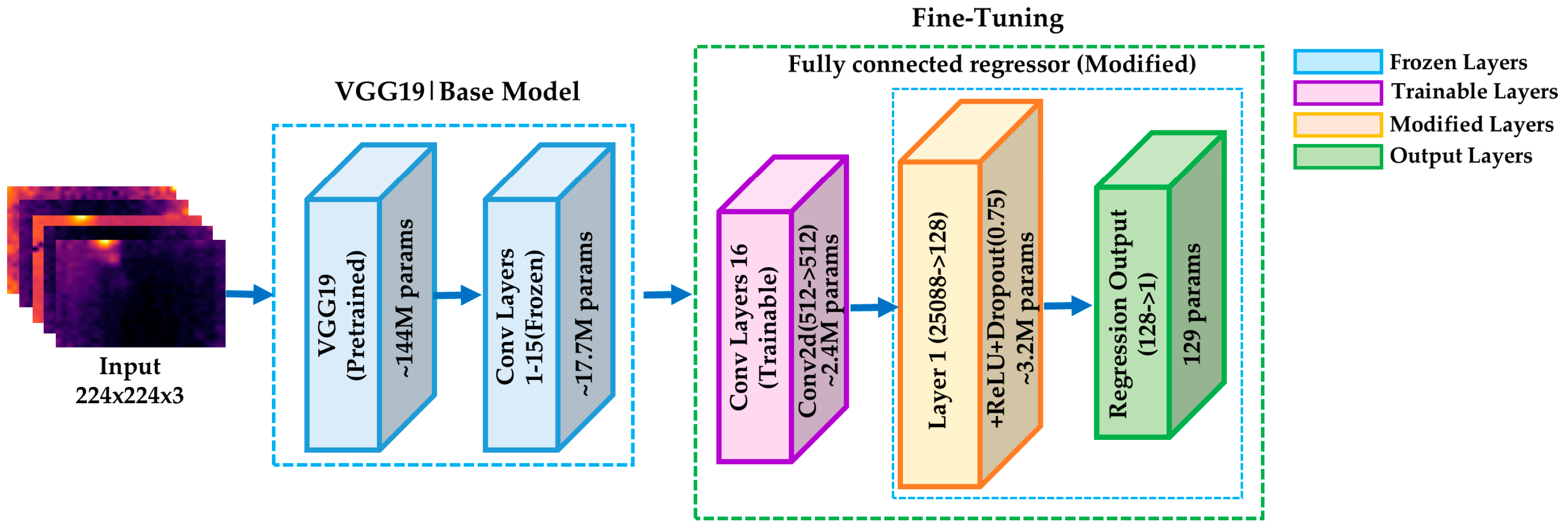 - In the case of VGG19, a conservative fine-tuning strategy was adopted to mitigate early overfitting identified in preliminary experiments. The original architecture comprises approximately 143.7 million parameters. Following adaptation to the regression problem, the final model was reduced to approximately 23.2 million parameters, of which approximately 5.6 million remained trainable and 17.7 million were kept frozen. Training was concentrated solely on the last convolutional layer of the feature extractor and on the new fully connected head designed for the regression task.