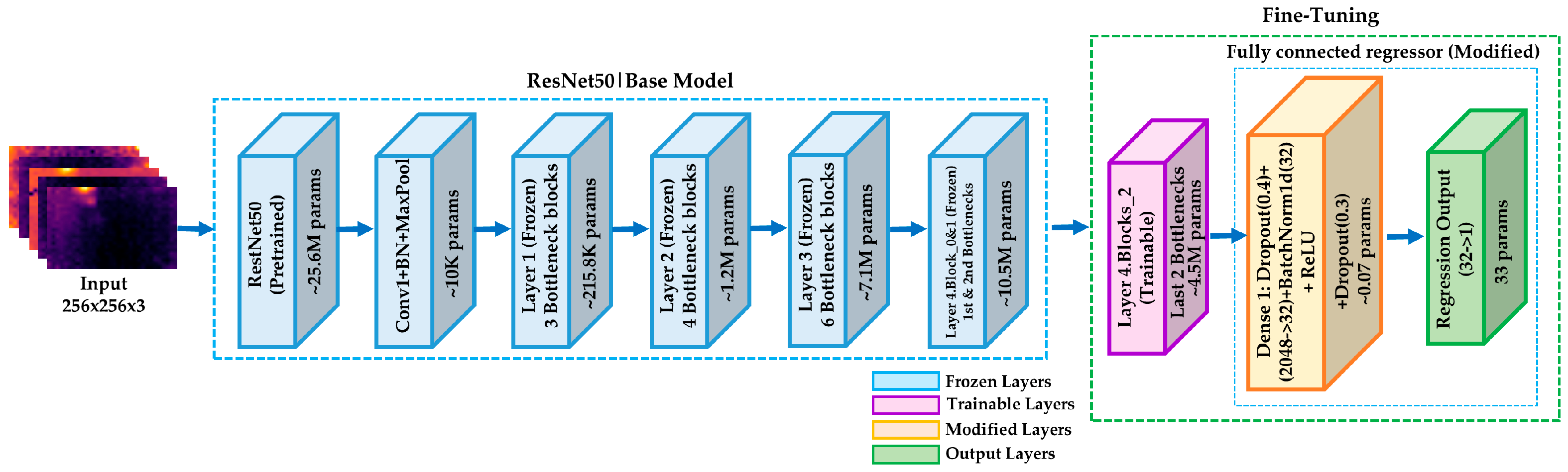 - The base architecture of ResNet50, composed of approximately 23.6 million parameters, was initially frozen in its entirety. Subsequently, the residual blocks were organized into a unified list grouping the four main sets of the network, layer1 (3 blocks), layer2 (4 blocks), layer3 (6 blocks), and layer4 (3 blocks), constituting a total of 16 architectural components. From this structure, only the upper portion of the model was enabled for training, corresponding to the last block of layer4 (layer4.2) and the regression head. Thus, the model was reduced to approximately 4.5 million trainable parameters, while 19.1 million remained frozen.
