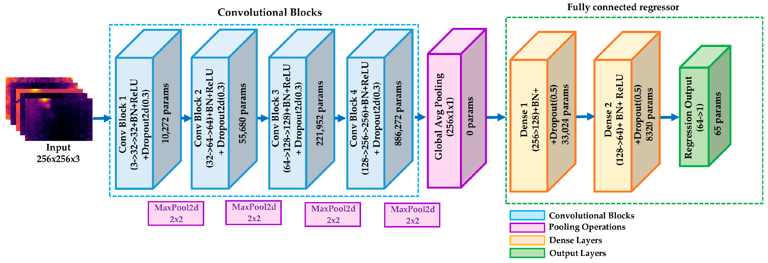 - The custom convolutional neural network architecture (PropNet-R) was designed to quantitatively estimate propane gas concentration from thermal images, predicting a single scalar value in ppm corresponding to the entire image, as recorded by the sensor at the time of capture. The network is organized into four progressive convolutional blocks that follow a systematic channel expansion pattern: 3→32→64→128→256.