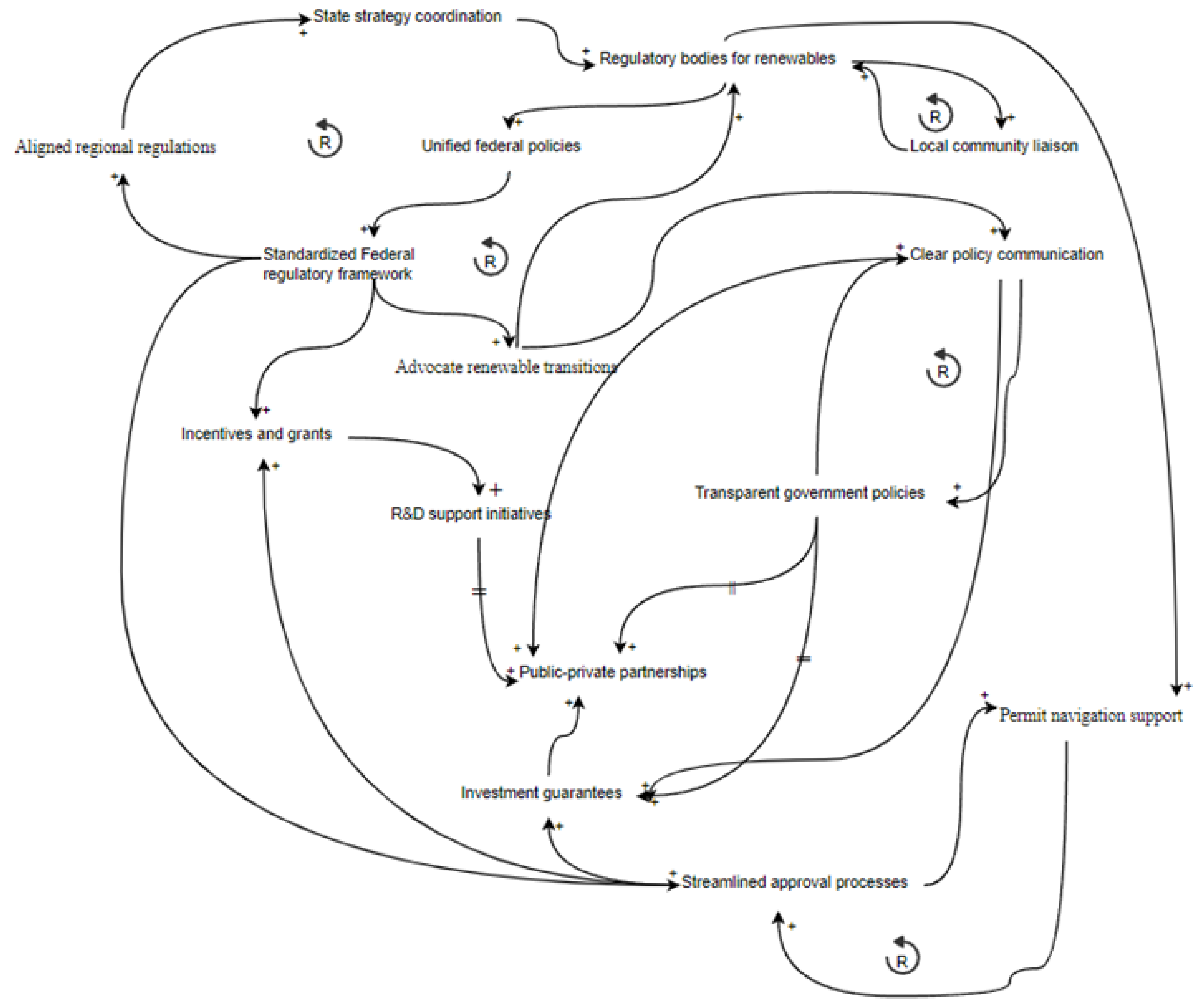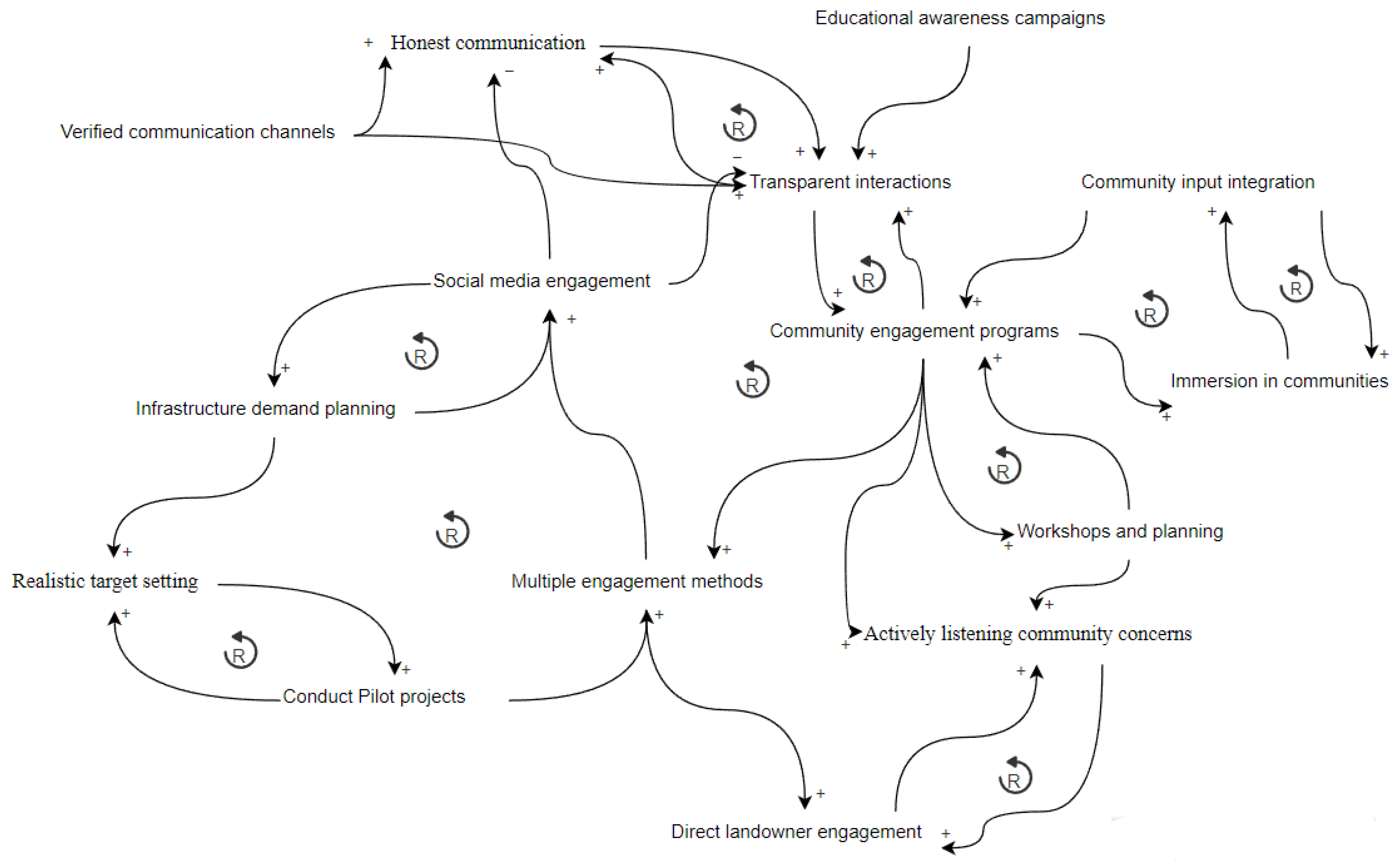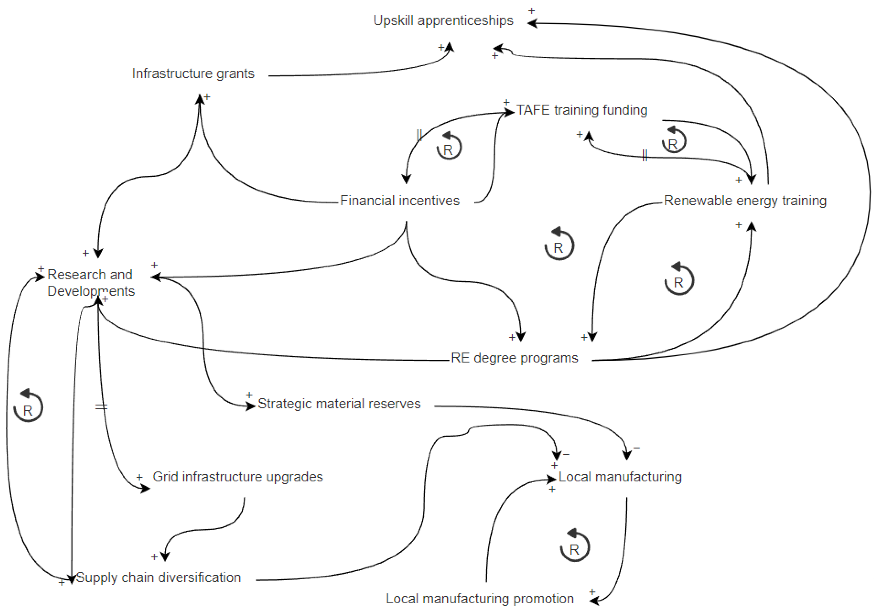 | Unified federal policies Incentives and grants Align regional regulations Federal regulatory framework State strategy coordination Transparent government policies Clear policy communication Advocate renewable transitions Investment guarantees Public–private partnerships R&D support initiatives Industry-stakeholder collaboration Regulatory bodies for renewables Streamlined approval processes Permit navigation support Local community liaison | I02 I02 I02 I02 I02 I03 I03 I03 I04 I04 I04 I04 I07 I07 I07 I10 | Verified communication channels Social media engagement Educational awareness campaigns Community engagement programs Stakeholder collaboration Workshops and planning Build stakeholder trust Incremental target setting Pilot project trials Infrastructure demand planning Address community concerns Immersion in communities Honest communication Community input integration Long-term community benefits Direct landowner engagement Transparent interactions | I01 I01 I01 I05 I05 I05 I05 I05 I05 I10 I11 I11 I11 I11 I11 I11 | Infrastructure grants Financial incentives TAFE training funding Specialized energy degrees Upskill apprenticeships RE training RE degree programs Local manufacturing promotion Supply chain diversification Strategic material reserves Grid infrastructure upgrades Optimal grid research | I04 I04 I06 I06 I06 I06 I06 I08 I08 I08 I09 I09 |