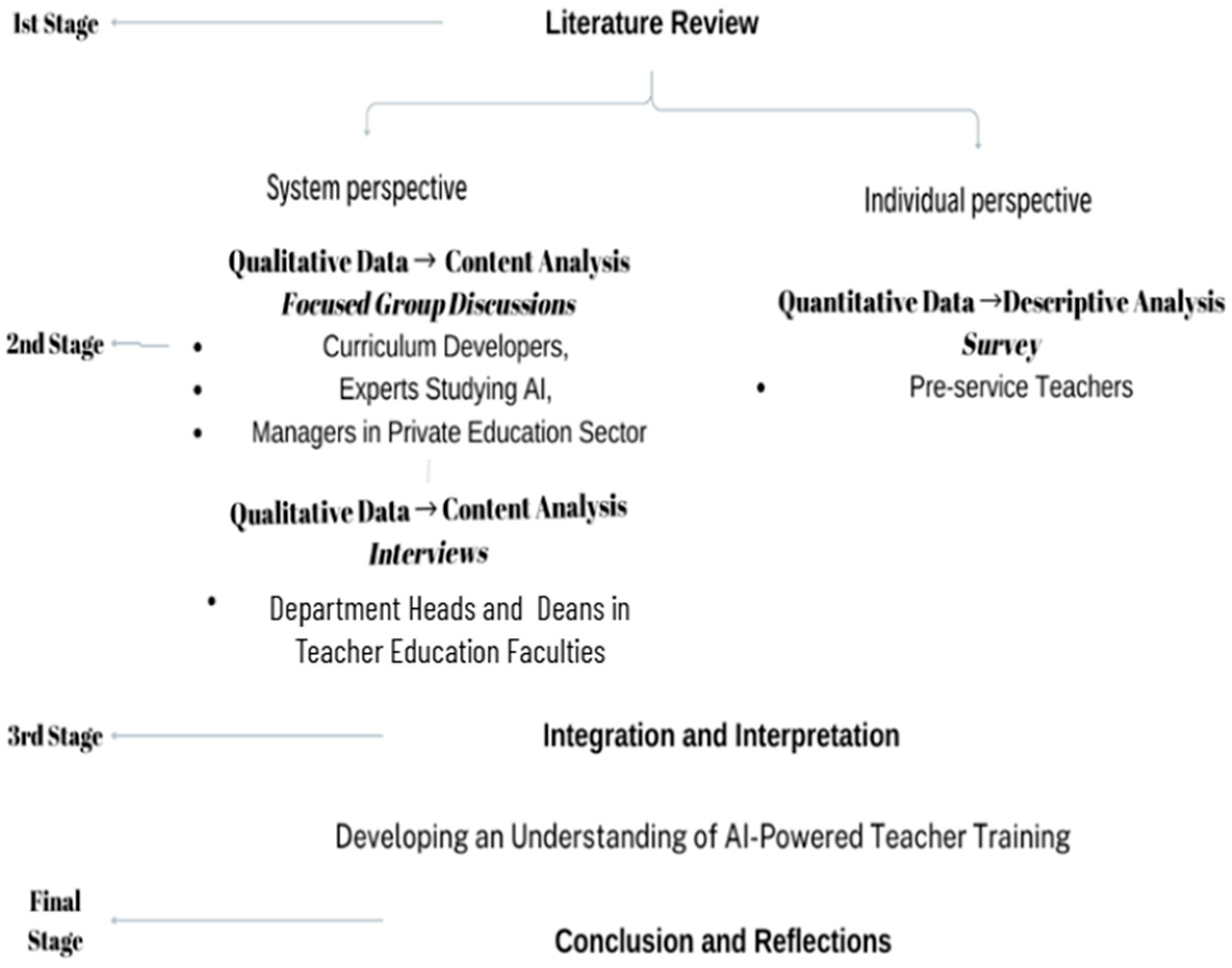 2] or teacher education ignored. This gap underscores the need to research how AI can strategically empower teacher education through the perspectives of diverse stakeholders (curriculum developers, AI experts, deans, private sector managers, and pre-service teachers).
