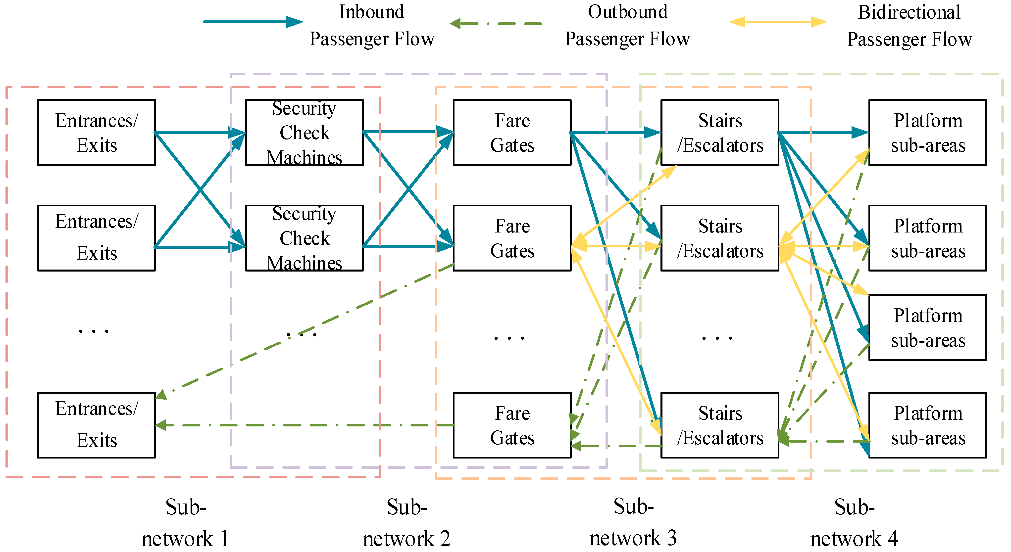 - Li, X.L.; Chen, Y.L.; Zhang, Z.X.; Zhang, Z.Y. Passenger flow organization optimization of rail transit stations connected with railway hubs. Sci. Technol. Eng. 2024, 24, 15242–15248. [Google Scholar] [CrossRef]
