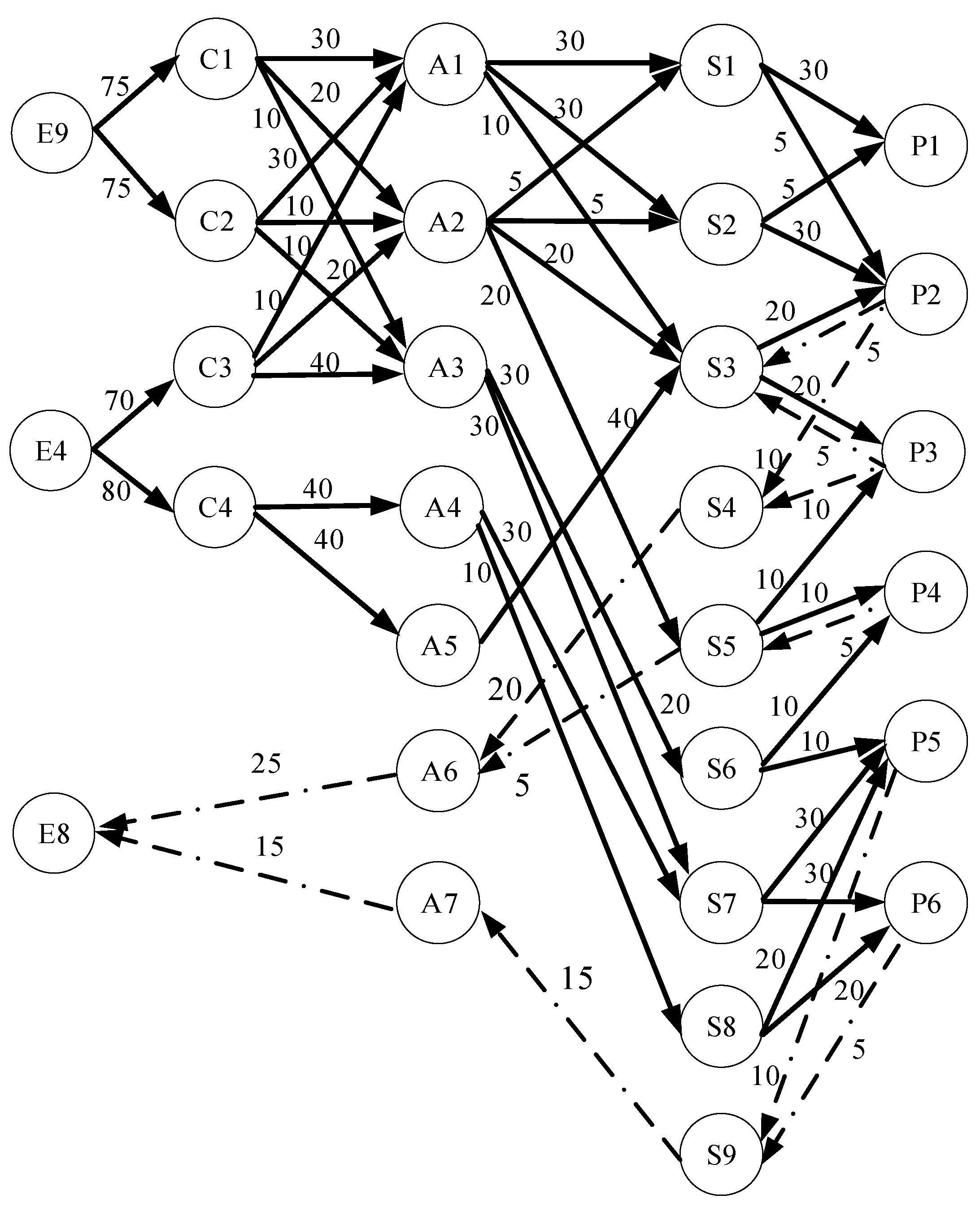 | The path connecting the kth upstream node and the lth downstream node in the ith sub-network | - | ||