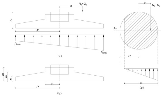Relevant requirements in the design specifications [6]. (a) Found structural shape parameters. (b) Schematic diagram of the foundation bottom not detached from the foundation. (c) Schematic diagram of the detachment of the foundation bottom from the foundation.