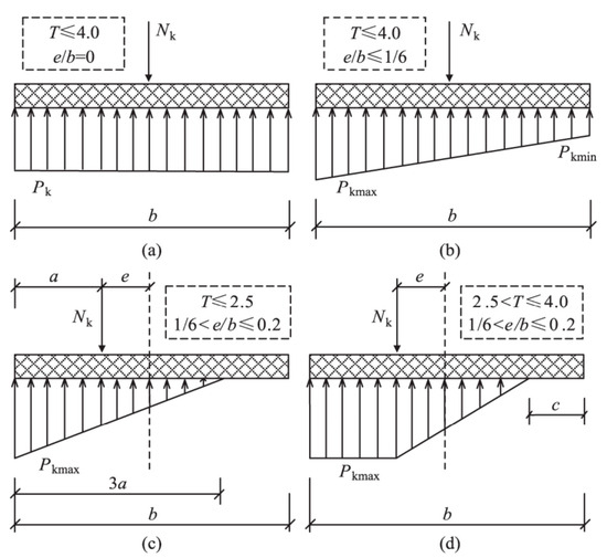 The simplified method of contact pressure under spread foundations [9]. (a) T ≤ 4.0, e/b = 0. (b) T ≤ 4.0, e/b ≤ 1/6. (c) T ≤ 2.5, 1/6 ≤ e/b ≤ 0.2 (d) 2.5 < T ≤ 4.0, 1/6 ≤ e/b ≤ 0.2.