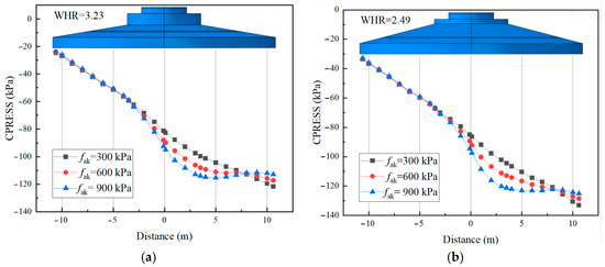 To investigate the extent to which geological conditions and width-to-height ratio affect the foundation base reaction forces, the characteristic values of the bearing capacity of the sandy soil bearing stratum at the foundation base were set to 300 kPa, 600 kPa, and 900 kPa, respectively. The finite element method was adopted to conduct a comparative analysis of the foundation soil reaction forces of the two foundation sizes. The contact stresses on the most unfavorable central axis of the soil at the base of the two foundation sizes were statistically analyzed, and the results are shown in Figure 4 and Figure 5. It can be concluded that compared with the foundation width-to-height ratio, the foundation soil stiffness has a more significant impact on whether the foundation soil reaction forces follow a linear distribution. When the foundation soil stiffness is relatively small, the foundation soil reaction forces of both foundations (with different width-to-height ratios) exhibit a good linear distribution pattern, meaning the width-to-height ratio has little influence at this point. As the foundation soil stiffness increases, the foundation soil reaction forces in the middle part of both foundations (with different width-to-height ratios) begin to increase gradually, showing a significant deviation from the linear distribution assumption.