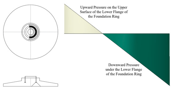 When calculating the upward punching shear of the lower flange of the foundation ring, the friction between the side wall of the foundation ring and the foundation concrete is neglected. The calculation is performed assuming that all the upper distributed loads are transmitted to the bottom flange, and the calculation diagram is shown in Figure 6. Under this condition, accounting for the contribution of the No. 8 and No. 9 reinforcements, the reinforced concrete structure around the foundation ring can resist an upward punching shear force of 58,760 kN. With a structural safety factor of 1.1, the maximum upward vertical punching shear force of the foundation ring is 17,792 kN. Thus, the anti-uplift safety factor is 3.30, which meets the requirements.