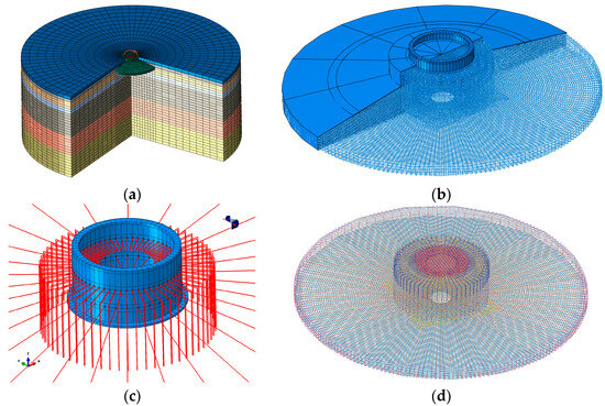 Based on the force calculation results for the foundation structure in Section 3, all indicators meet the requirements except for the width-to-thickness ratio of the cantilever slab outside the foundation, which is 3.23 and exceeds the specification limit of 2.5. To further investigate the influence of the large width-to-thickness ratio on the bearing capacity of wind power spread foundations on sandy soil, a refined three-dimensional finite element model including the soil was established using finite element software. A detailed analysis was conducted on the stress conditions of the foundation concrete, reinforcement, foundation ring, and foundation soil. The overall finite element model is shown in Figure 7. In the finite element model, the Mohr-Coulomb plastic model [16,17,18] was adopted for the soil, which was modeled using C3D8R elements. The material properties of the soil were set in layers according to the geological survey report, with the internal friction angle of coarse sand being 33°. A fully fixed constraint was applied to the bottom surface of the soil, while horizontal constraints were imposed on the side surfaces. Frictional contact was used between the soil and concrete, with a friction coefficient of 0.3. The foundation ring is modeled using solid elements, and frictional contact is adopted between the foundation ring and concrete with a friction coefficient of 0.5. For concrete, the Concrete Damaged Plasticity (CDP) elastoplastic constitutive model [19,20,21] is employed, and the reinforcement is embedded in the concrete using Truss elements. The total number of unit meshes in the overall model is 120,869, among which the number of soil meshes is 47,659, concrete meshes is 30,066, reinforcement meshes is 30,528, and foundation ring meshes is 12,616.