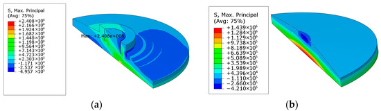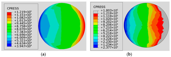 As shown in Figure 16a, based on the contact pressure (CPRESS) between the foundation bottom and the foundation soil, no separation occurs under the normal operating condition, meeting the requirements. Under the ultimate limit state condition of bearing capacity, a small separation area is observed at the foundation bottom, as illustrated in Figure 16b. The separation area ratio is 4.45%, which is below the limit value of 25%, thus also satisfying the requirements.