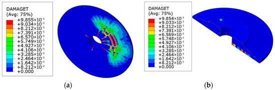 Tensile plastic damage nephogram at the bottom of the foundation concrete. (a) Bottom view of the tensile damage plane. (b) Cross-sectional view of the tensile damage surface.