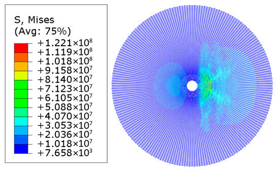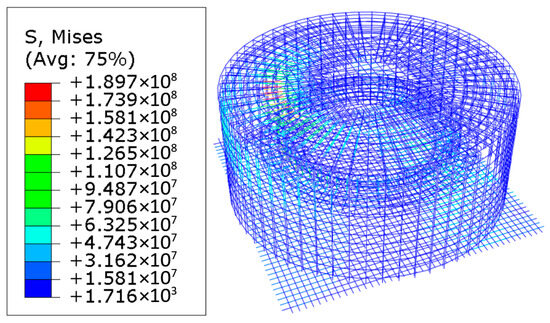 The tensile damage nephogram of the concrete is shown in Figure 10. The local tensile damage factor of the foundation reaches 0.98, indicating a certain degree of tensile plastic damage; however, since the reinforcement in the base slab participates in load-bearing, no through cracks are ultimately formed. Under extreme load conditions, the local tensile stress at the foundation base slab exceeds the standard limit. However, when the cracking extends to the bottom layer of the base slab reinforcement, the crack propagation stops; the reinforcement then participates in force-bearing, and no through cracks are formed. In addition, as calculated in the aforementioned “3.6 Calculation of Bottom Slab Cracks”, the foundation base slab does not crack under normal operating conditions, which meets the requirements permitted by the code.
