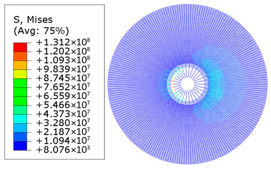The overall Mises stress nephogram of Rebars ①~④ in the foundation base slab is shown in Figure 11. Among these four types of rebars, Rebar ② exhibits the highest stress, with a value of 122 MPa, which is below the design yield strength of HRB400 steel reinforcement, thereby meeting the design requirements. The overall Mises stress nephogram of Rebars ⑤~⑦ in the foundation top slab is presented in Figure 12. Among these five types of rebars, Rebar ⑤ has the maximum stress, reaching 131 MPa, which is less than the design yield strength of HRB400 steel reinforcement, thus satisfying the design requirements.