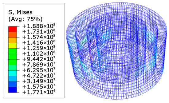 The overall stress nephogram of Rebars ⑧~⑩ in the foundation base slab is shown in Figure 13. Among these three types of rebars, Rebar ⑧ shows the highest stress, with a value of 189.6 MPa. The statistics of the overall and individual Mises stress for Rebars ⑭~⑱ and ㉖~㉛ around the foundation ring are provided in Figure 14. Among these 11 types of rebars, Rebar ⑮ carries the maximum stress, at 189.7 MPa. The stress values of all the aforementioned rebars are below the design yield strength of HRB400 steel reinforcement, meeting the design requirements.