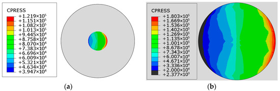 Contact stress nephogram between foundation and ground (a) Serviceability working condition (b) Ultimate limit state condition of bearing capacity.