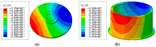 Under the standard combination of the serviceability limit state, the maximum vertical displacement of the foundation is −2.414 mm, as shown in Figure 17a. The tilt rate at the foundation bottom is 0.15‰, which is below the limit requirement of 3‰ (applicable for H > 100 m), thus meeting the specifications. The vertical displacement at the bottom flange of the tower tube is −2.345 mm, with a corresponding flange tilt rate of 0.59‰, as presented in Figure 17b.